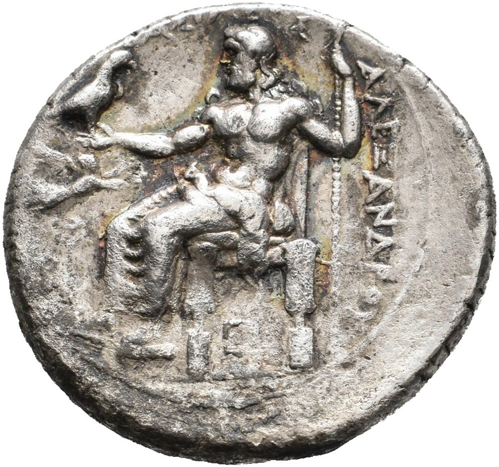 KINGS of MACREDON. Philip III Arrhidaios. 323-317 BC. AR Tetradrachm (28 mm; 16.53 g). In the name of Alexander III. Tarsos mint, struck under Philotas or Philoxenos. Head of Heracles right, wearing lion skin headdress / BAΣIΛEΩΣ ΑΛΕΞΑΝΔΡΟ, Zeus Aëtophoros seated left on throne, holding eagle in outstretched right hand and and scepter in left; in left field, Nike flying right, holding wreath, above B and kerykeion; monogram below throne. Some roughness in fields and a few hairlines from cleaning. Light iridescent toning.