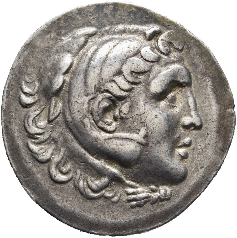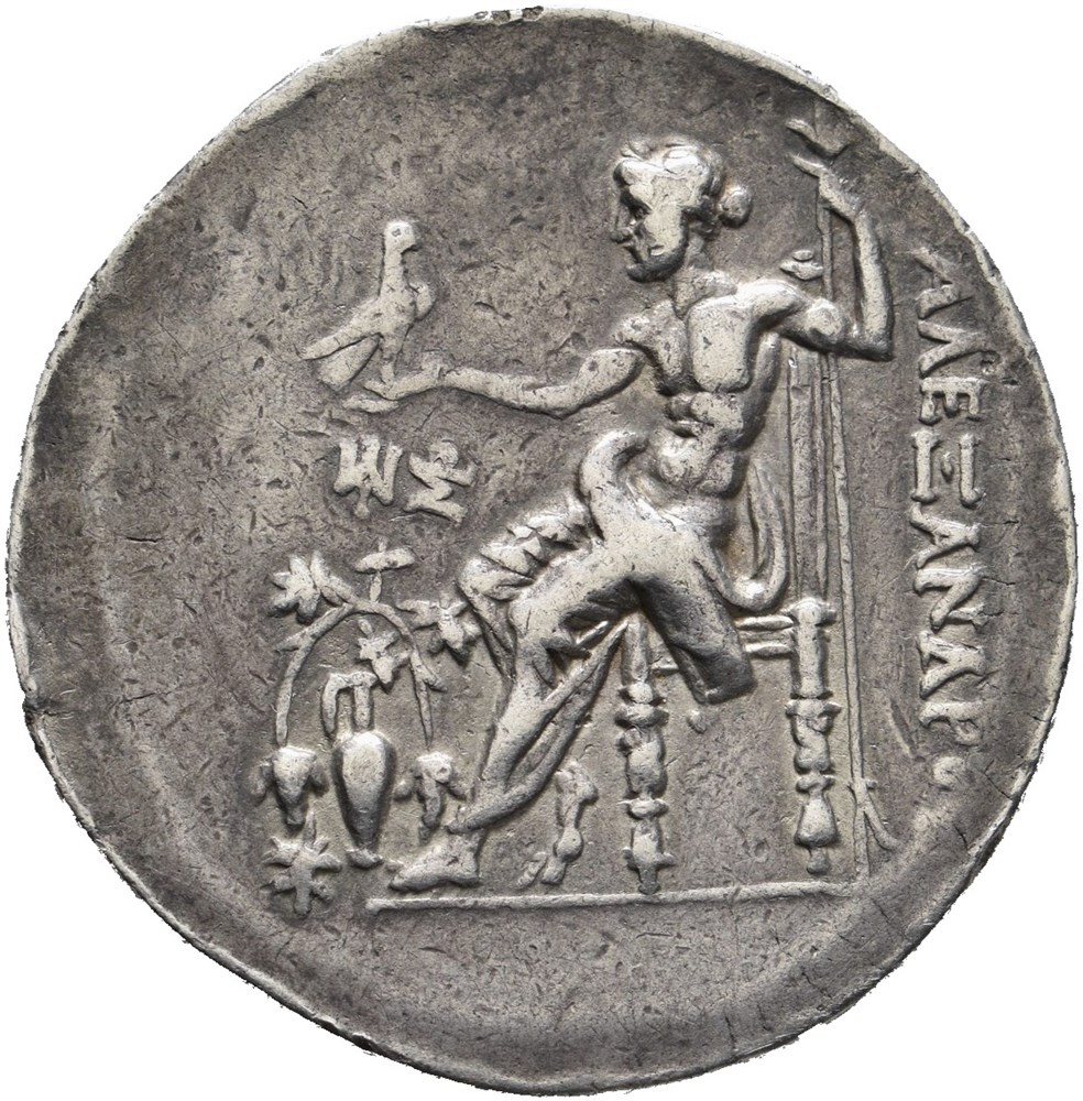 AEOLIS, Temnos. Circa 188-162 BC. AR Tetradrachm (34 mm; 16.33 g). In the name and types of Alexander III of Macedon. Head of Herakles right, wearing lion skin headdress / AΛΕΞΑΝΔΡOY, Zeus Aëtophoros seated left on throne, holding eagle in outstretched right hand and resting on scepter with left; in left field, two monograms above oinochoe within vine tendril. Attractively toned.