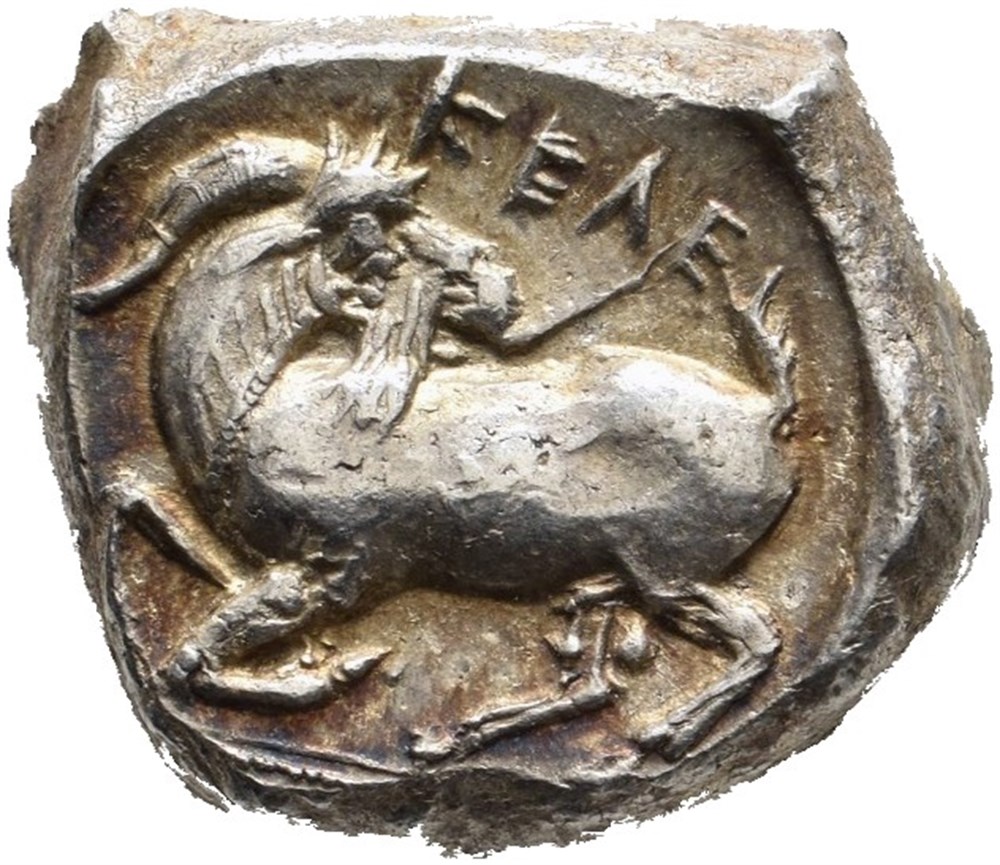 CILICIA, Kelenderis. Circa 430-420 BC. AR Stater (20 mm; 10.69 g). Nude youth, holding whip, dismounting from horse rearing left; Π below horse / KEΛE, Goat kneeling left, head right, within shallow incuse circle. Struck on a rugged flan and minor die-break on reverse. Light iridescent toning with some underlying luster.