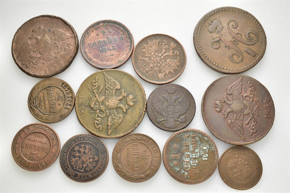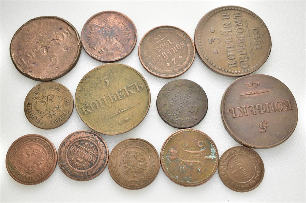 Lott 13 stk. russiske mynter, 1-5 kopek 1833-1916