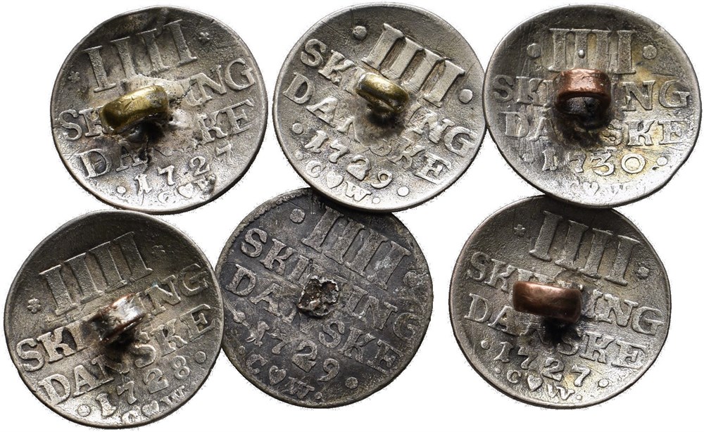 4 skilling 1727-1730, 6 stk lagd om til knapper