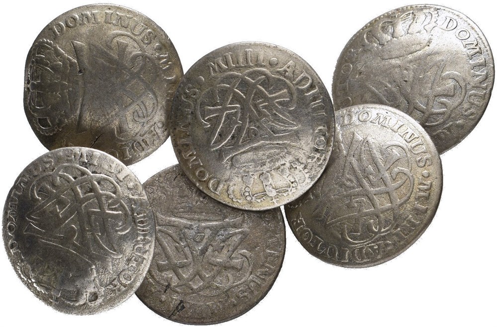 4 skilling 1727-1730, 6 stk lagd om til knapper.