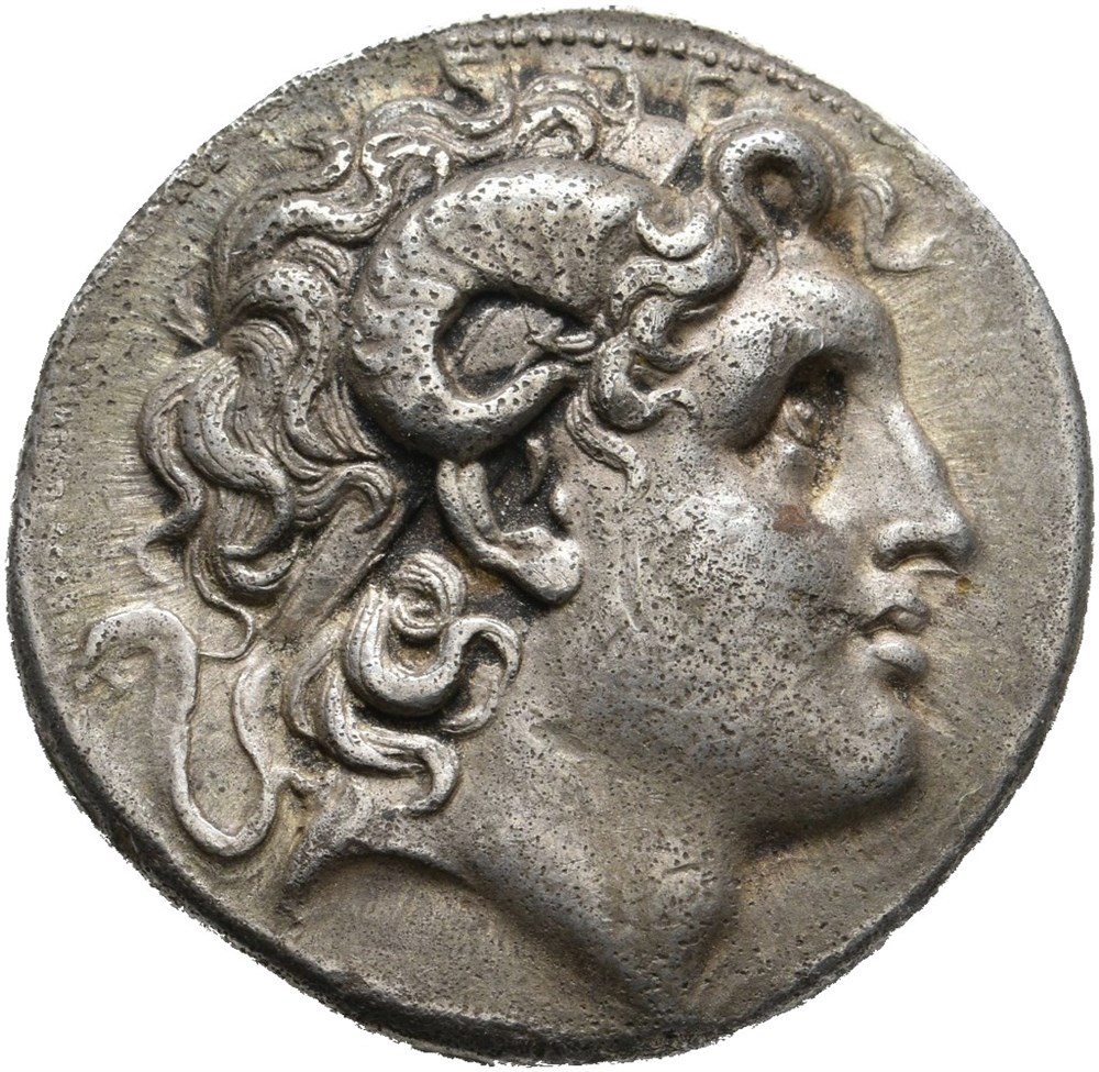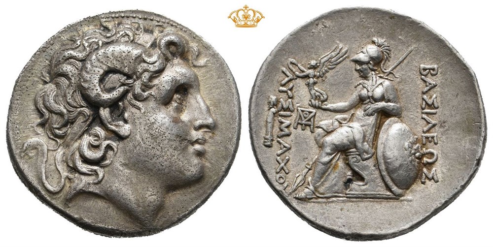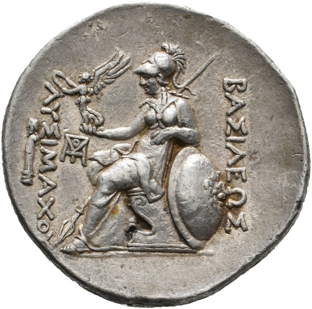 KINGS of THRACE. Lysimachos 305-281 BC. AR Tetradrachm (31 mm; 16.61 g). Lampsakos mint, struck 297-281 BC. Diademed head of the deified Alexander right, wearing horn of Ammon / ΒΑΣΙΛΕΩΣ - ΛΥΣΙΜΑΧΟY, Athena Nikephoros seated left, holding Nike in outstretched right hand and resting left arm on shield, transverse spear in background; herm to outer left, monogram to inner left. Some scattered corrosion in obverse field, otherwise, well struck and attractively toned.