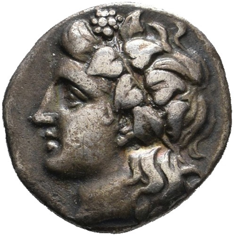 THESSALY, Lamia. Circa 400-350 BC. AR Hemidrachm (15 mm; 2.43 g). Head of Dionysos left, wearing ivy wreath / ΛΑΜΙΕ – ΩΝ, Amphora; ivy leaf above; to right, prochous with handle to right. Minor roughness in fields. Deep old cabinet toning.