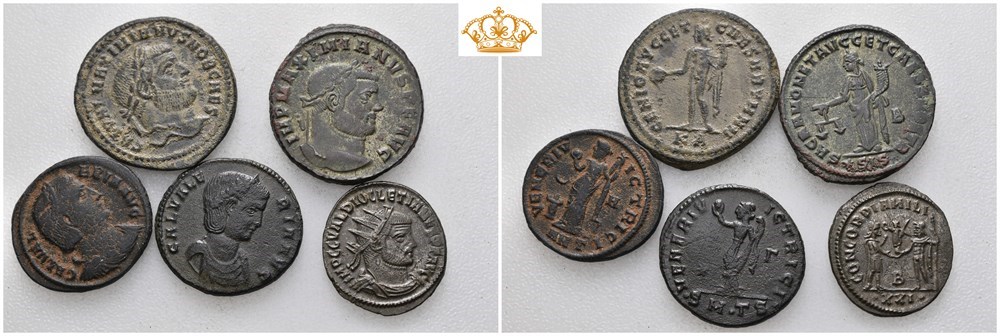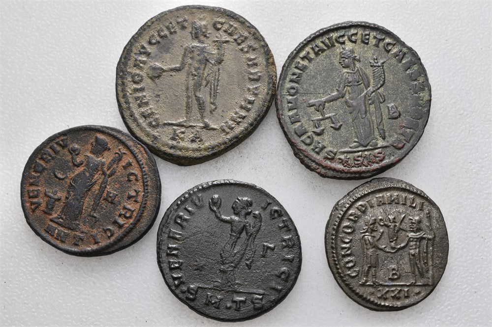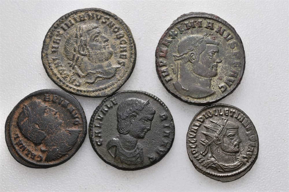 Lot of 5 roman folles and radiates; Diocletian radiate (1); Galerius follis (1); Maximian follis (1); Galeria Valeria folles (2). TOTAL of 5 coins in lot