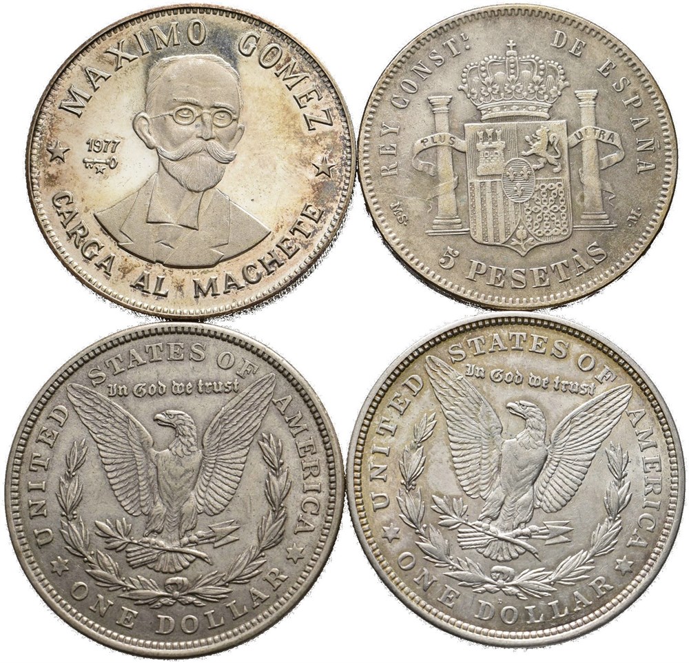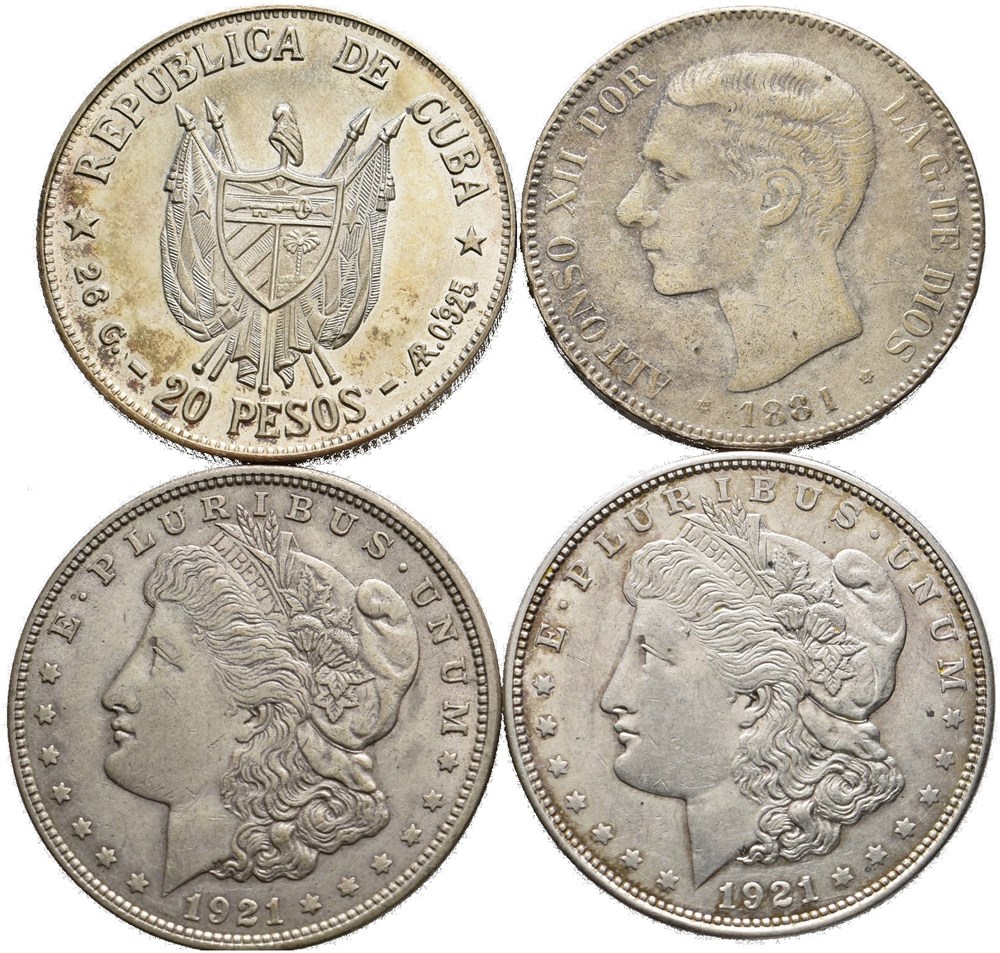 Cuba 20 pesos 1977, Spain 5 pesetas 1881, USA 1 dollar 1921 and 1921 D.