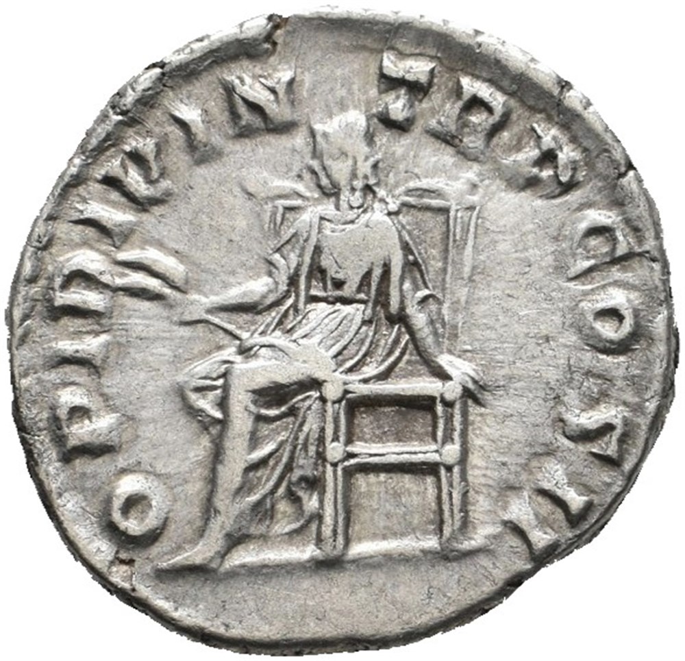 Pertinax, AD 193. AR Denarius (3.23 g). Rome mint. Laureate head right / Ops seated left on throne, holding two grain ears with right hand and resting left hand on seat of throne. Lightly toned and with some underlying luster.