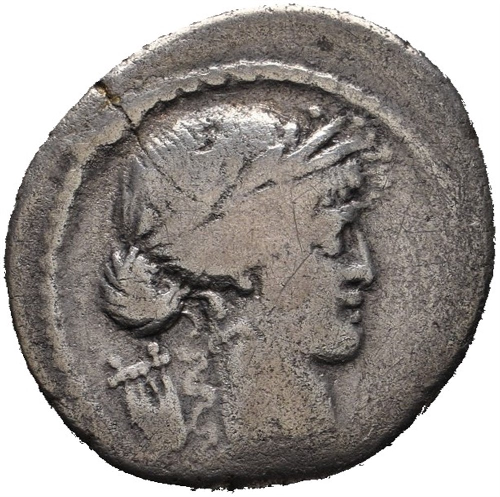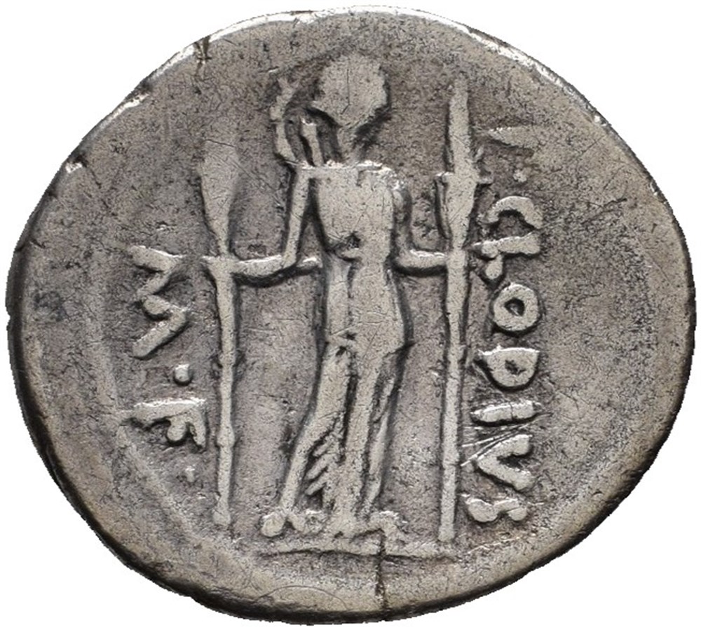 P. Clodius M.f. Turrinus. 42 BC. AR Denarius (3.14 g). Rome mint. Laureate head of Apollo right; lyre behind / Diana Lucifera standing right, bow and quiver over her shoulder, holding a torch in each hand. Toned.