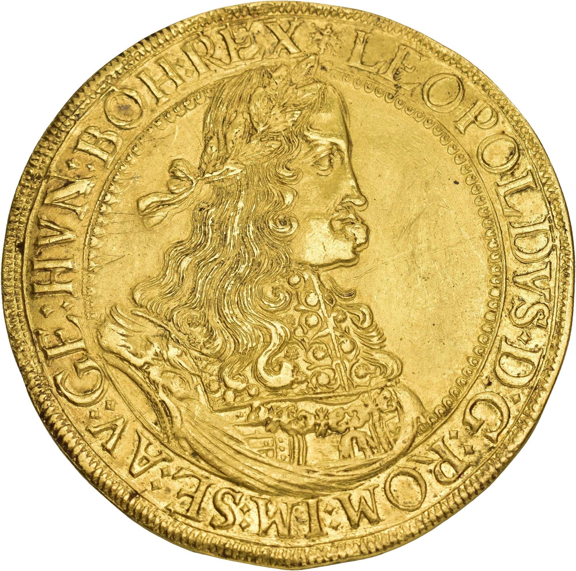 10 Ducats 1682, Graz. 34.98 g. Mintmaster Johann Anton Novak. LEOPOLDVS D G ROM IM SE AV GE HVN BOH REX / ARCHI AVS DVX BVRG STYRIAE E 16 82. Small scratches in field behind bust. Small trace of filing on rim. Very rare and without the usual traces of mounting or graffiti.