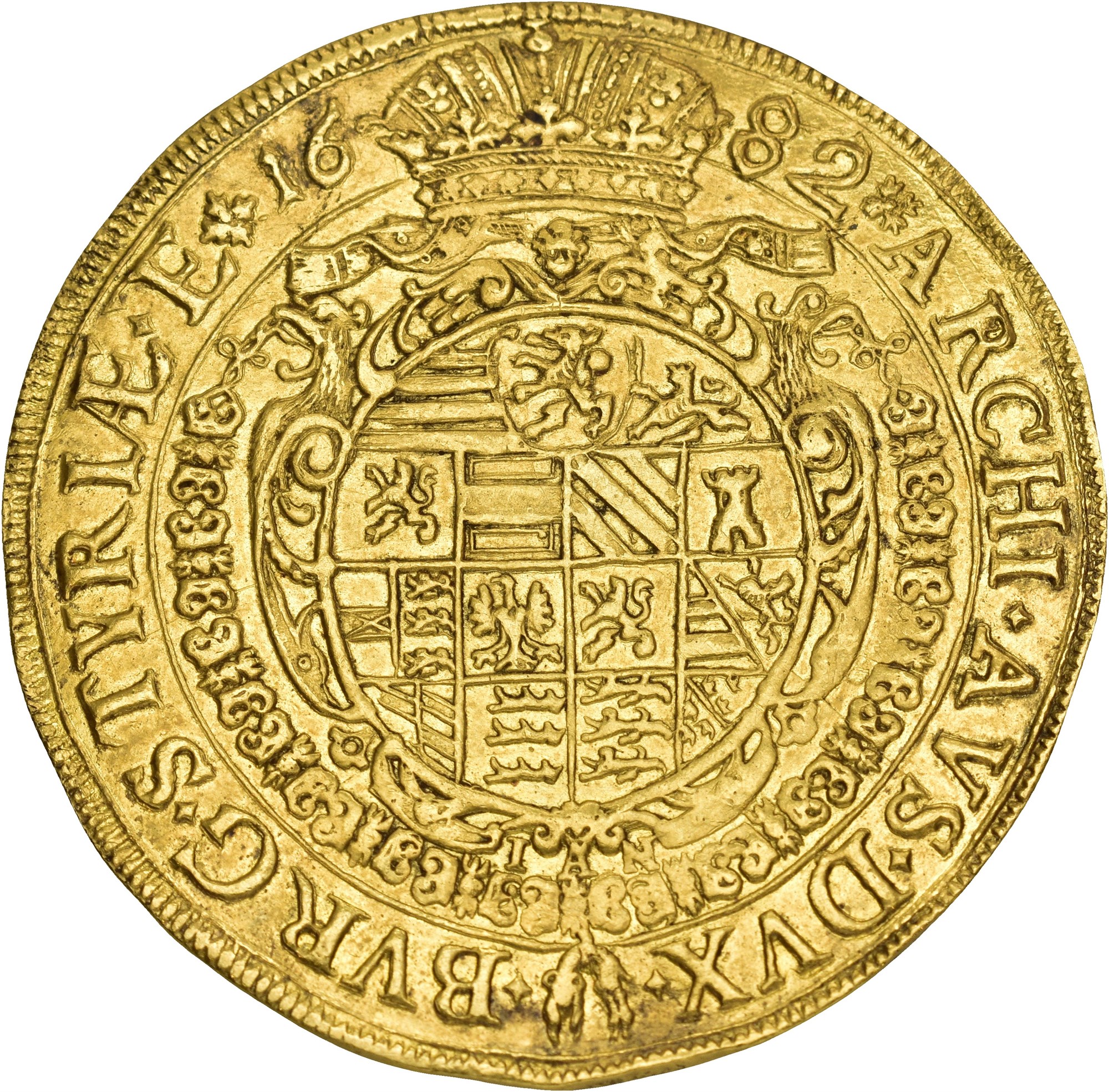 10 Ducats 1682, Graz. 34.98 g. Mintmaster Johann Anton Novak. LEOPOLDVS D G ROM IM SE AV GE HVN BOH REX / ARCHI AVS DVX BVRG STYRIAE E 16 82. Small scratches in field behind bust. Small trace of filing on rim. Very rare and without the usual traces of mounting or graffiti.