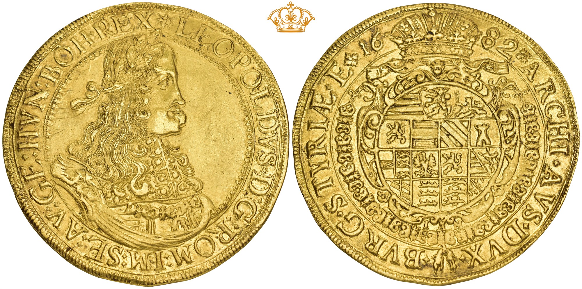 10 Ducats 1682, Graz. 34.98 g. Mintmaster Johann Anton Novak. LEOPOLDVS D G ROM IM SE AV GE HVN BOH REX / ARCHI AVS DVX BVRG STYRIAE E 16 82. Small scratches in field behind bust. Small trace of filing on rim. Very rare and without the usual traces of mounting or graffiti.