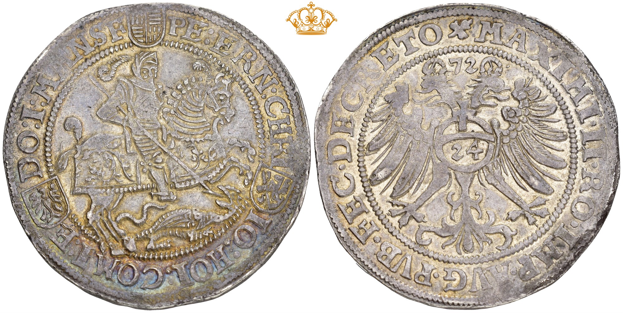 Taler 1572, Eisleben. 29.08 g. Small planchet flaw. Beautiful patina. Very rare in this lovely condition