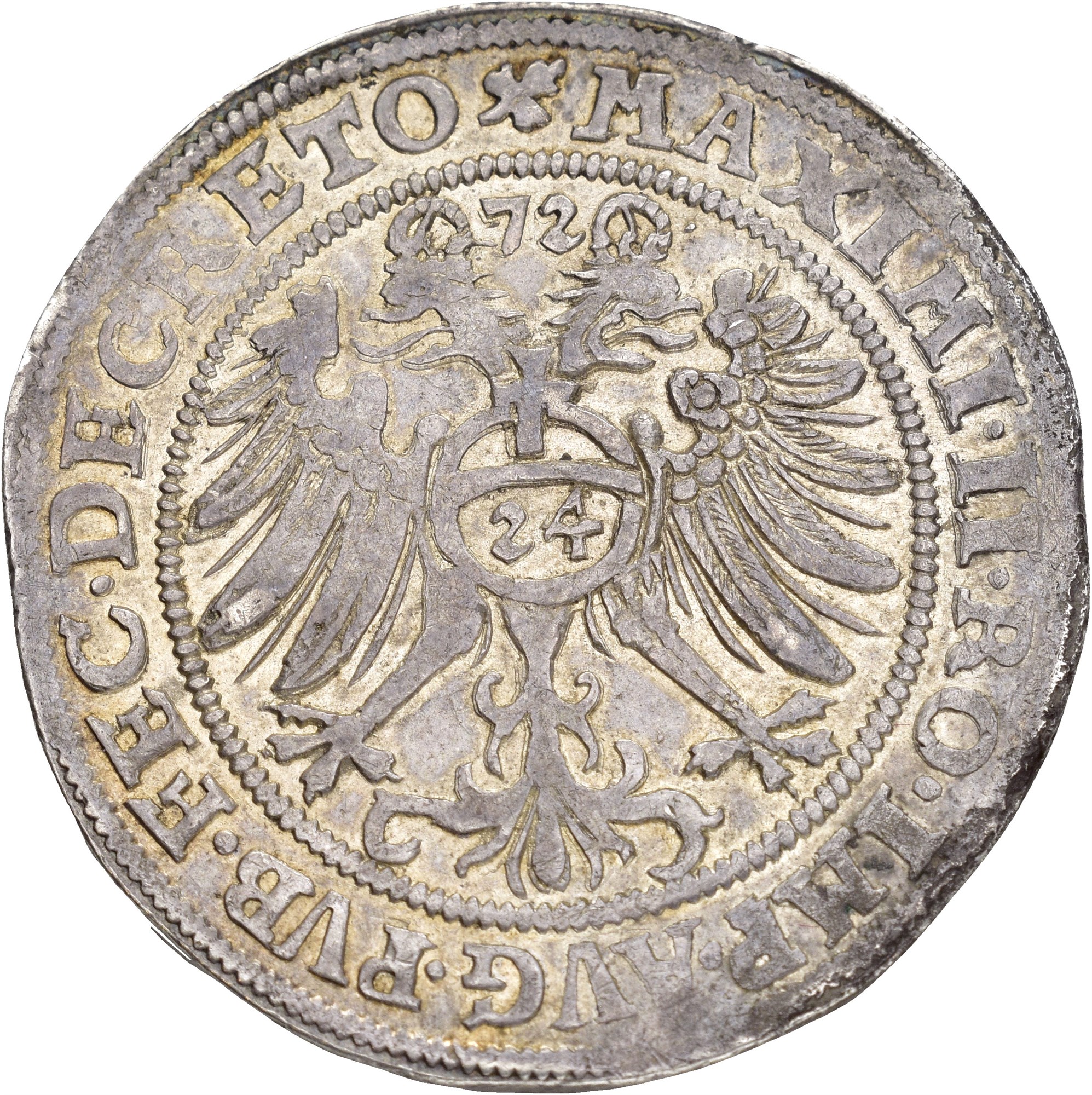 Taler 1572, Eisleben. 29.08 g. Small planchet flaw. Beautiful patina. Very rare in this lovely condition