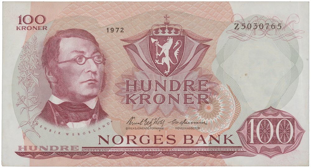 100 kroner 1972. Z5030765. Erstatningsseddel/replacement note (5-million). Uvanlig/uncommon.