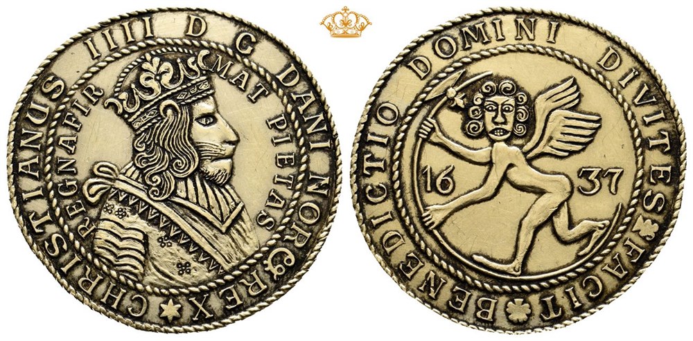 Moderne immitasjon/modern immitation: Fiigenschou 10 dukatt, en fantasifull og humoristisk reproduksjon av Christian IVs norske speciedaler fra 1637. 40 mm, 42,66 g