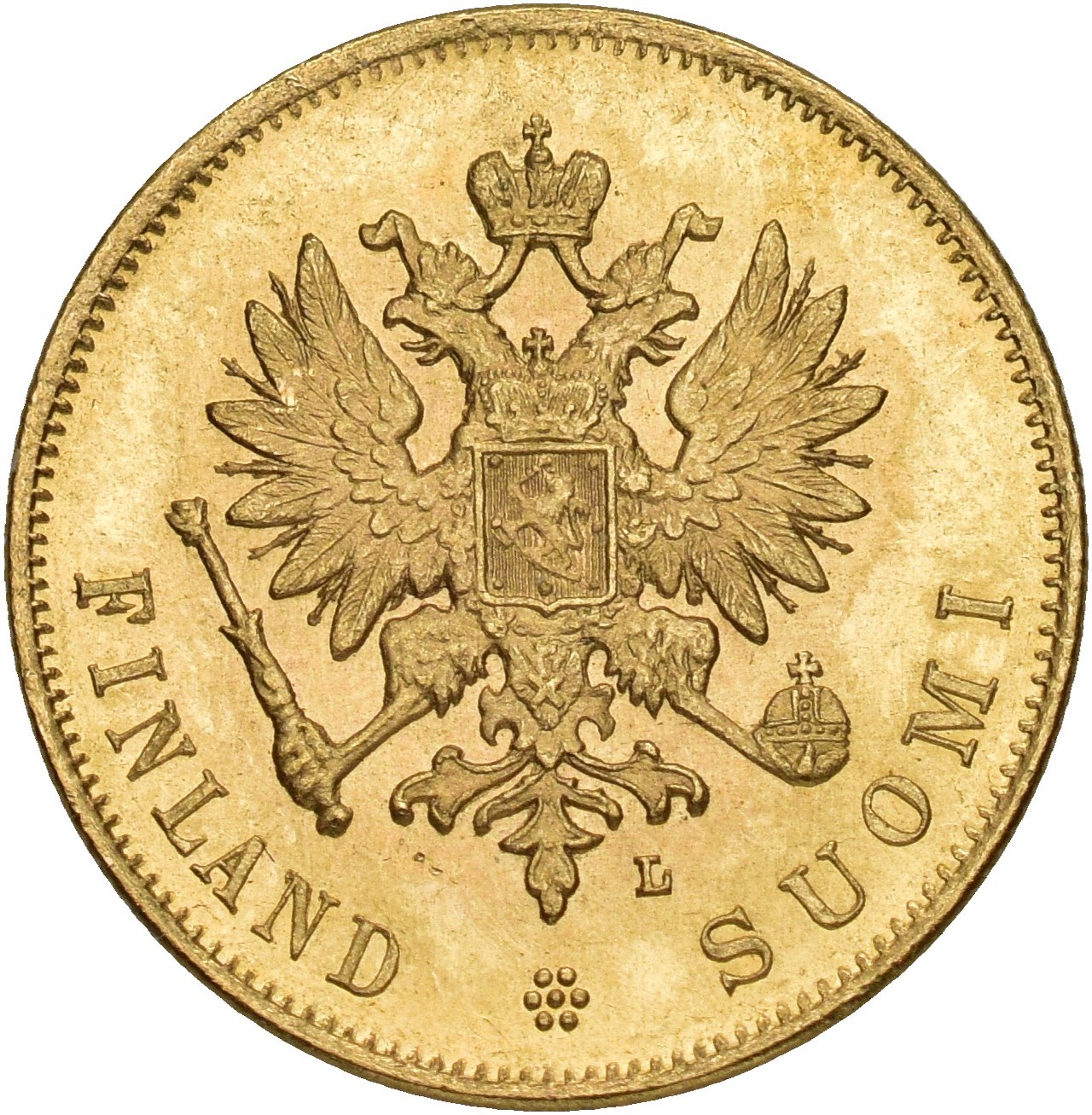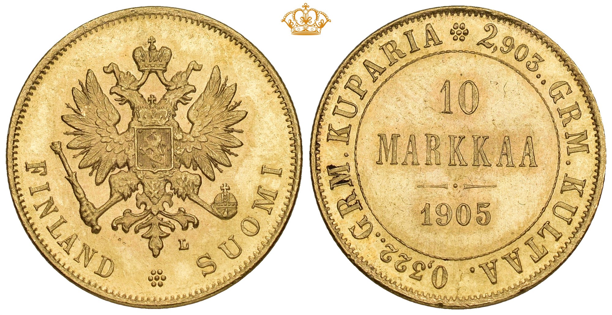 10 Markkaa 1905 L, Helsinki. 3.23 g. Key date. Lustrous.