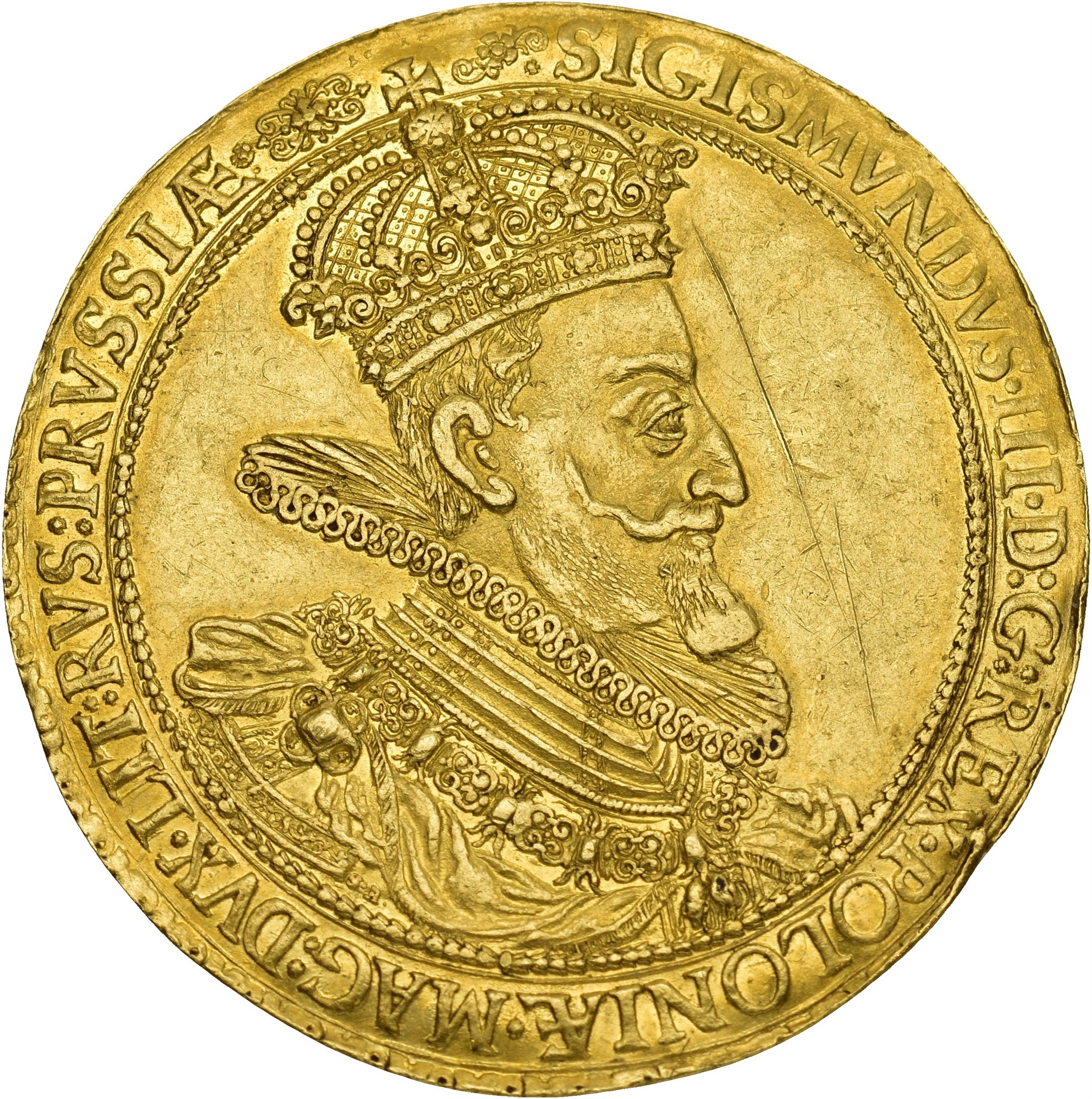 5 Ducats 1614, Danzig. 17.43 g. Dies by Samuel Ammon. With the title of Sigismund III (1587-1632). Two lions holding city coat of arms, crowned by palm and laurel branches. On reverse crowned and armoured bust of Sigismund with the Order of the Golden Fleece facing right. Scratches in right obverse field, edge nicks.