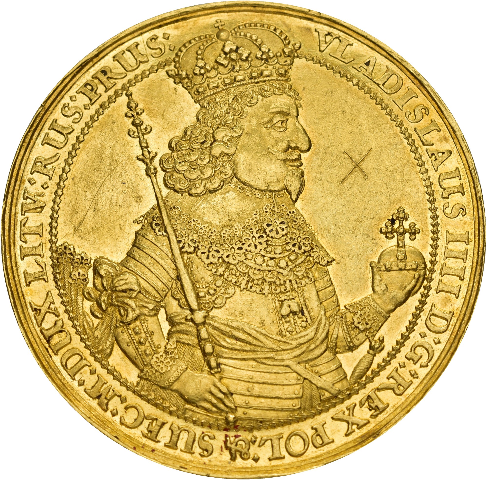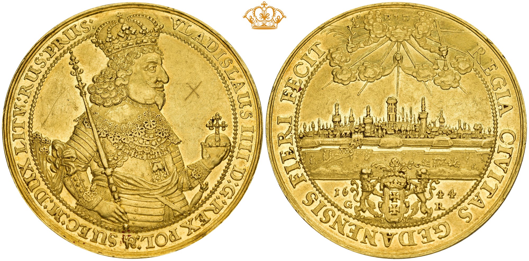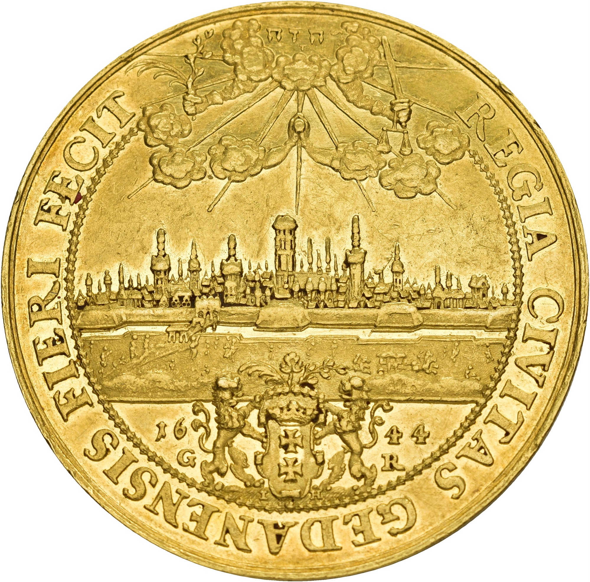 10 Ducats 1644, Danzig. 34.64 g. Mintmaster Gerard Rogge. REGIA CIVITAS GEDANENSIS FIERI FECIT, view of city of Gdansk (Danzig) and tetragrammaton with four arms emerging from clouds, two arms holding olive branch or sword and scales, two arms with hands clasped together. VLADISLAuS IIII D G REX POL & SuEC M DuX LITV RuS PRuS, crowned bust holding scepter and orb.