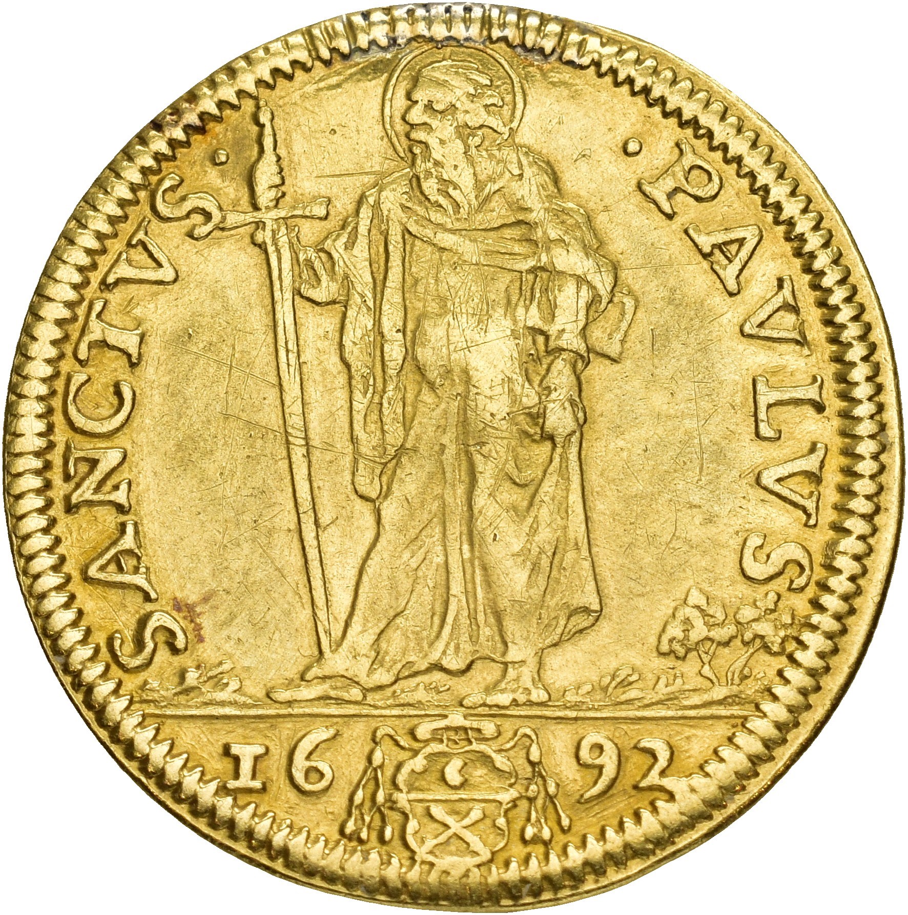 Doppia 1692, Rome. 6.49 g. Traces of mounting in top, tooled. Rare.