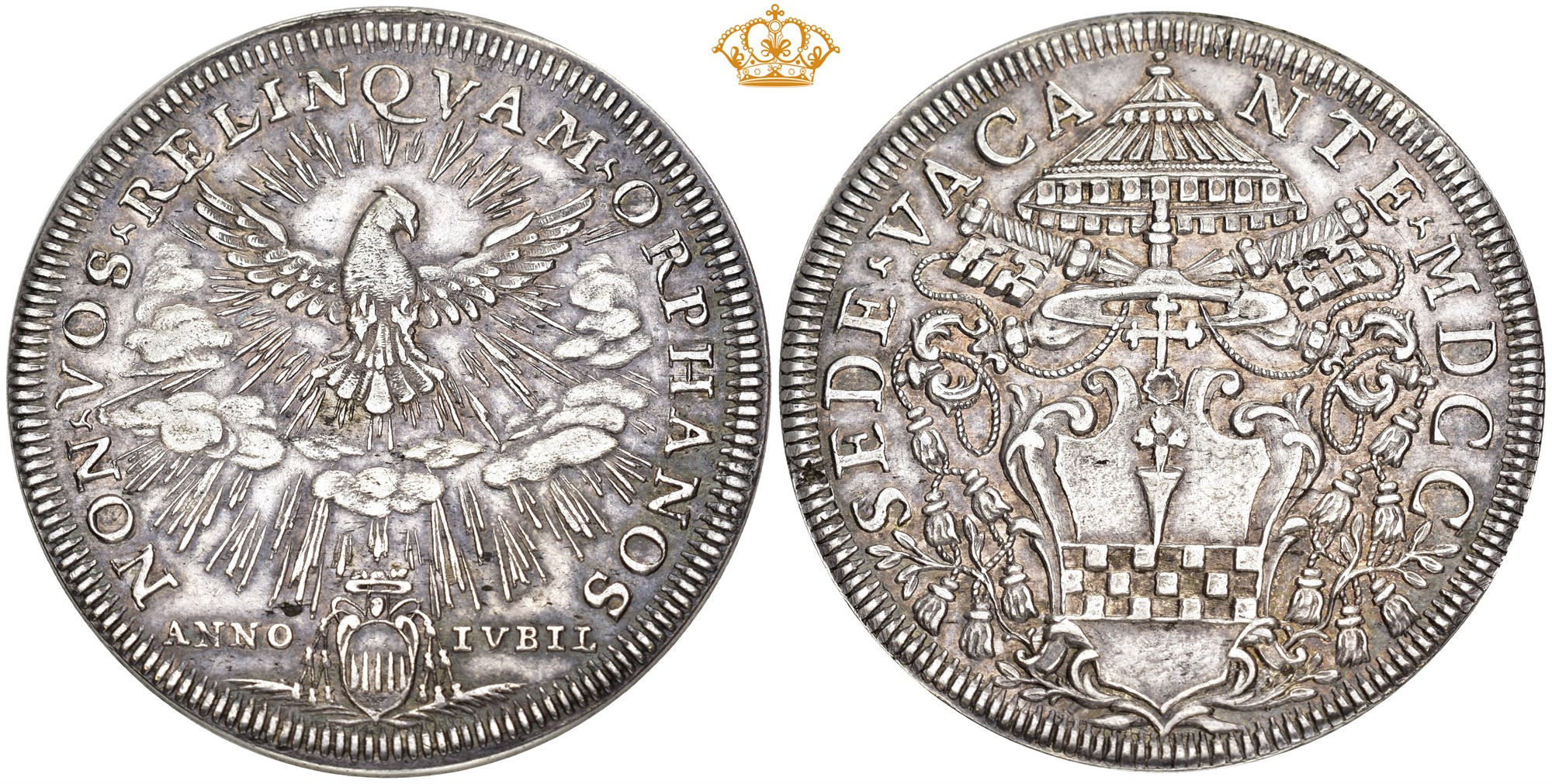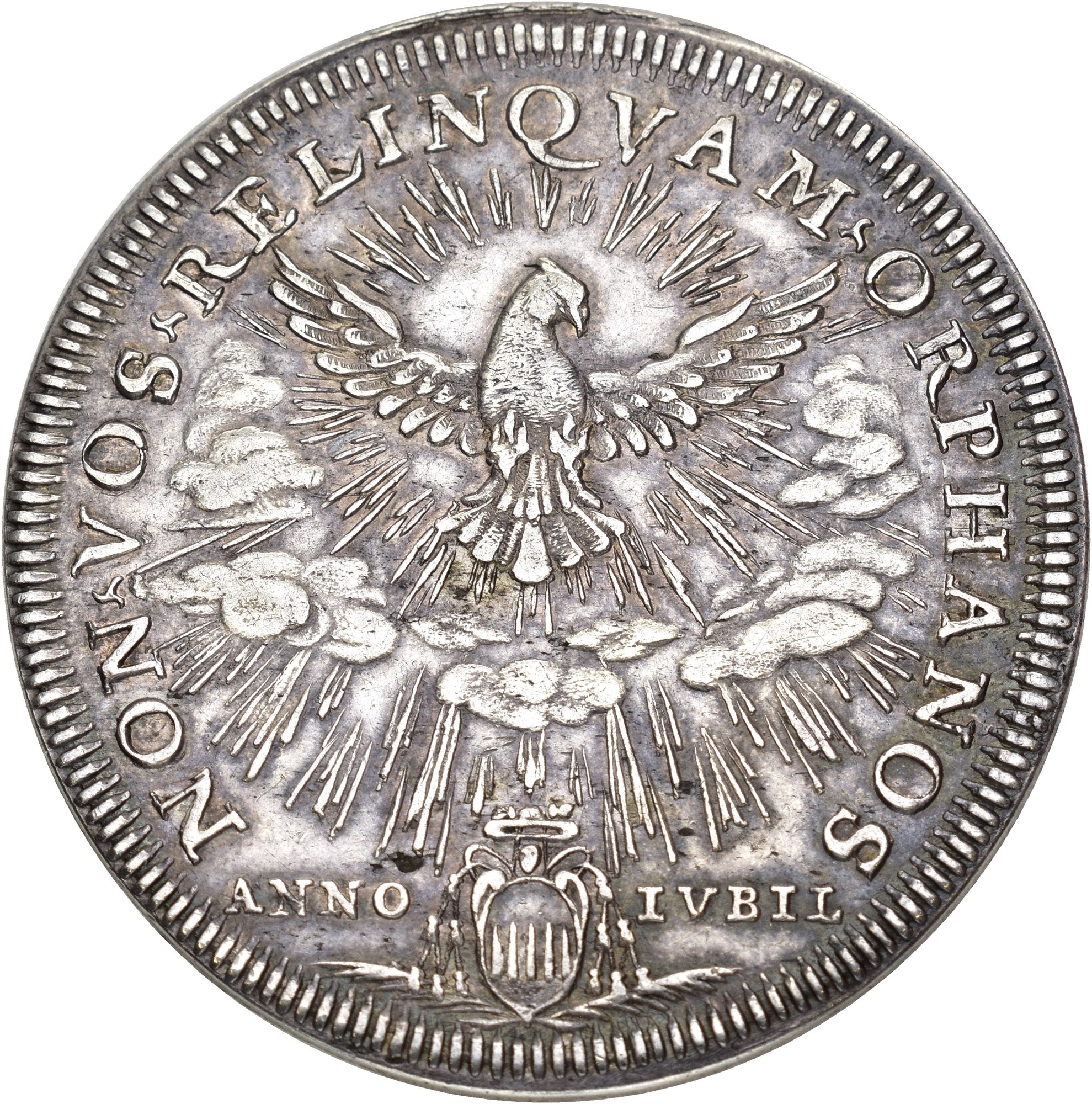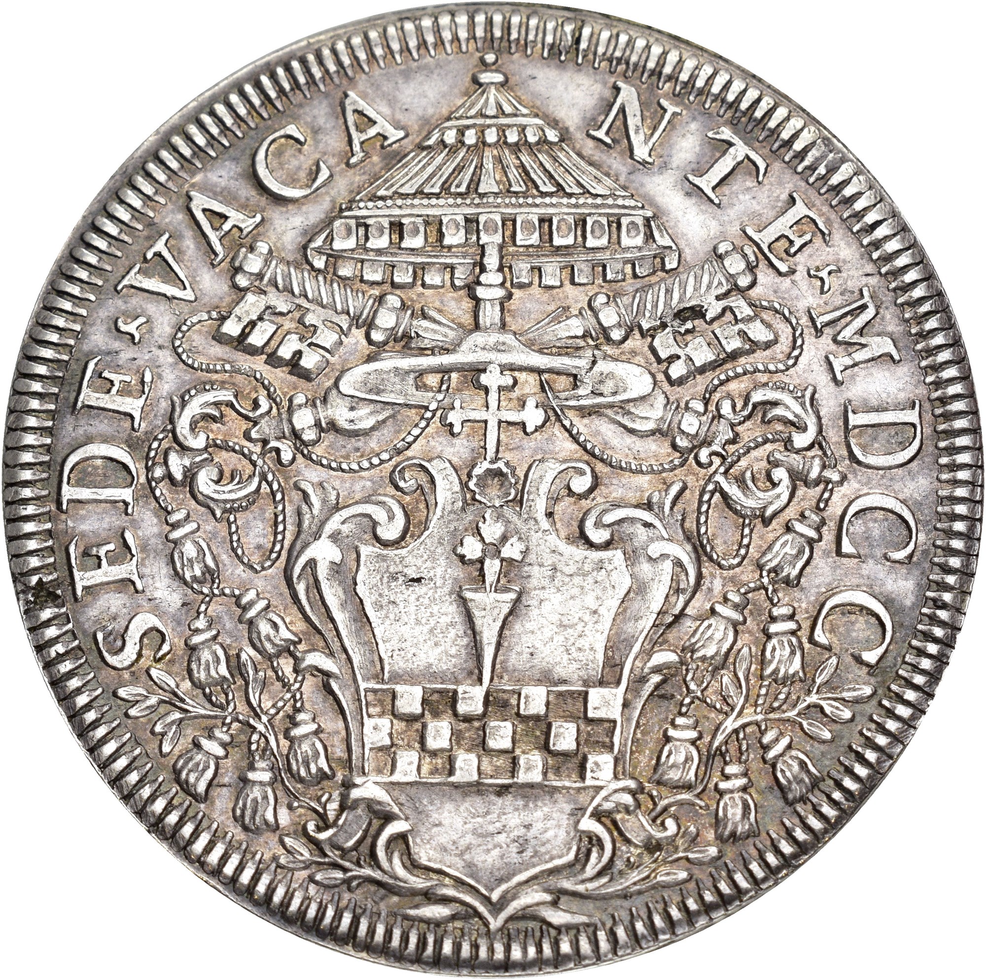 Scudo 1700, Bologna. 32.03 g. Arms of Cardinal with crossed keys and parasol. Reverse with Holy Dove. Trace of filing on rim.