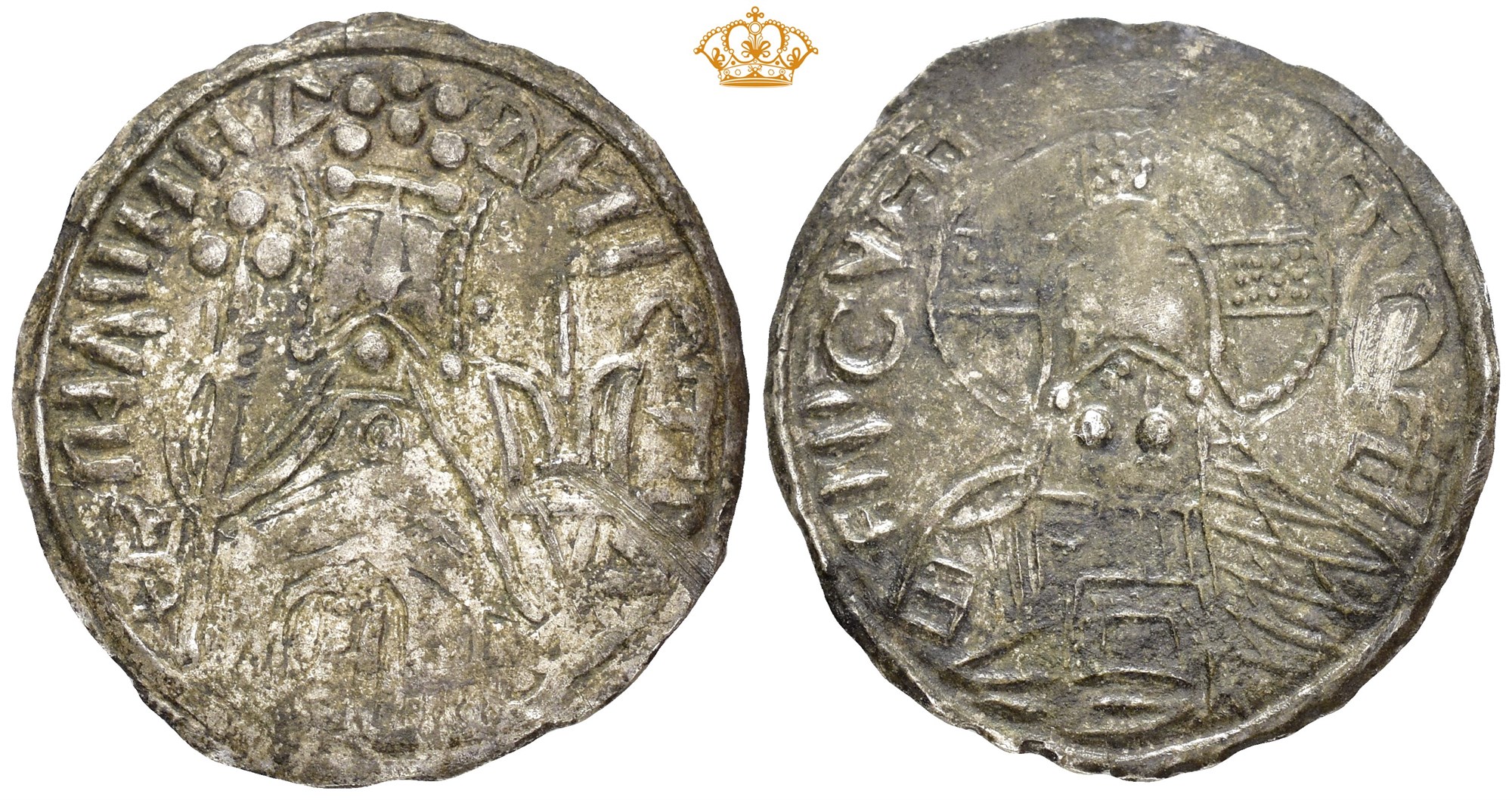 Srebrennik, Kiev. 2.02 g. Type 1, struck 998-1010. Standing Prince Vladimir holding long cross in his left hand, tamgha in right field. On reverse facing nimbate figure of Christ. Rare in this condition.