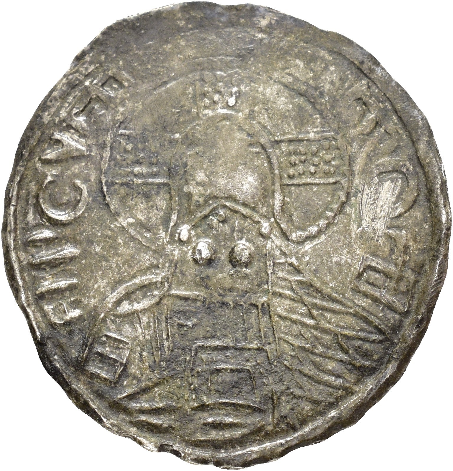 Srebrennik, Kiev. 2.02 g. Type 1, struck 998-1010. Standing Prince Vladimir holding long cross in his left hand, tamgha in right field. On reverse facing nimbate figure of Christ. Rare in this condition.