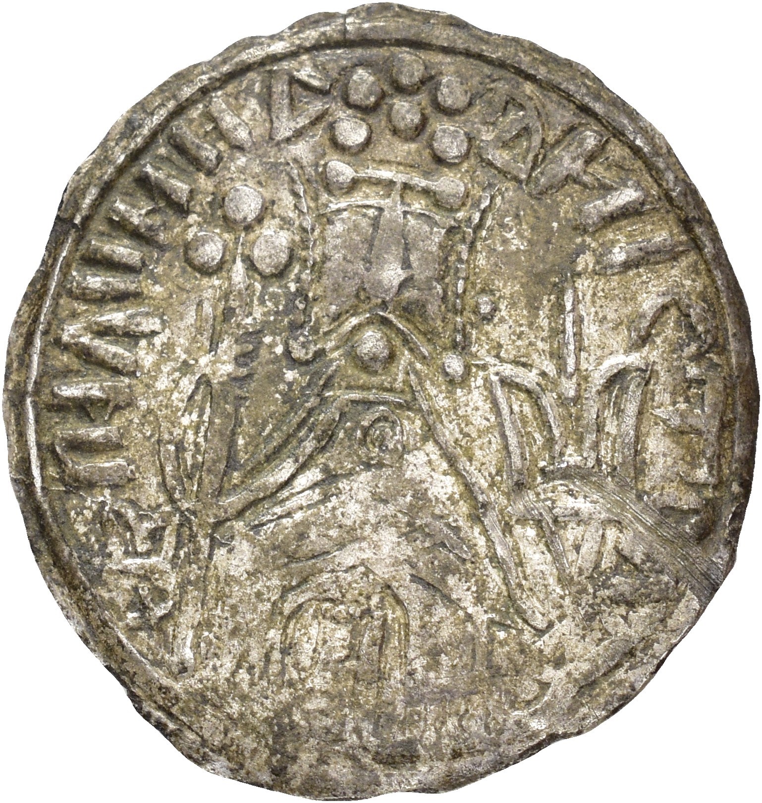 Srebrennik, Kiev. 2.02 g. Type 1, struck 998-1010. Standing Prince Vladimir holding long cross in his left hand, tamgha in right field. On reverse facing nimbate figure of Christ. Rare in this condition.