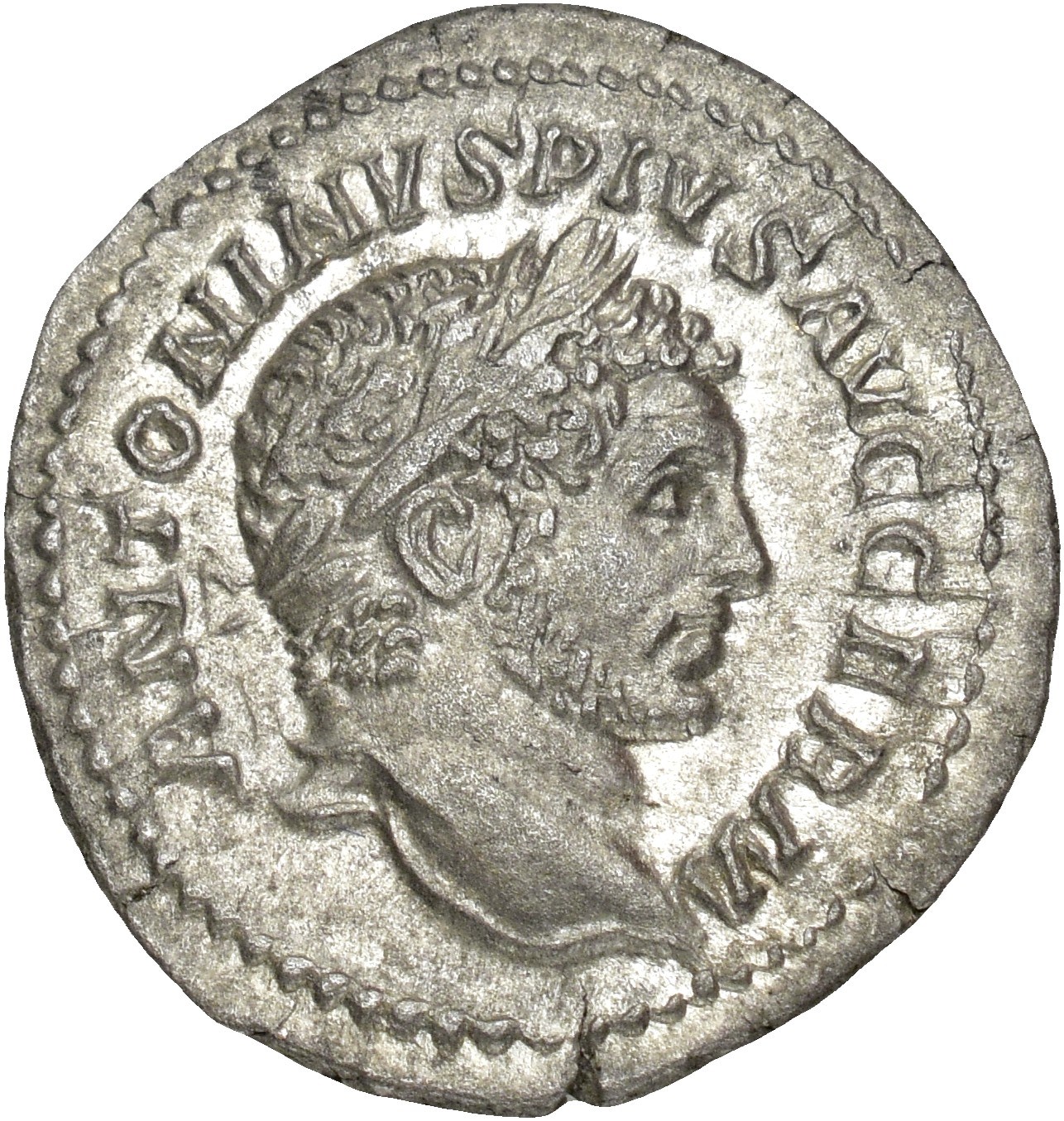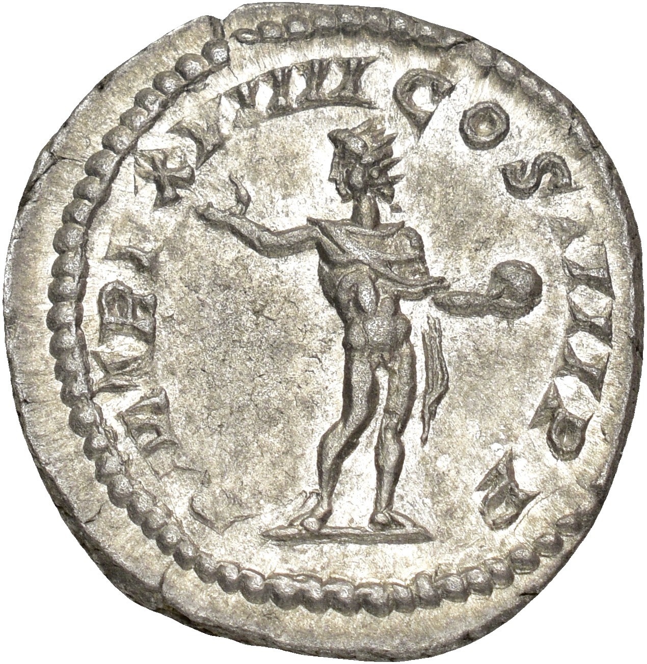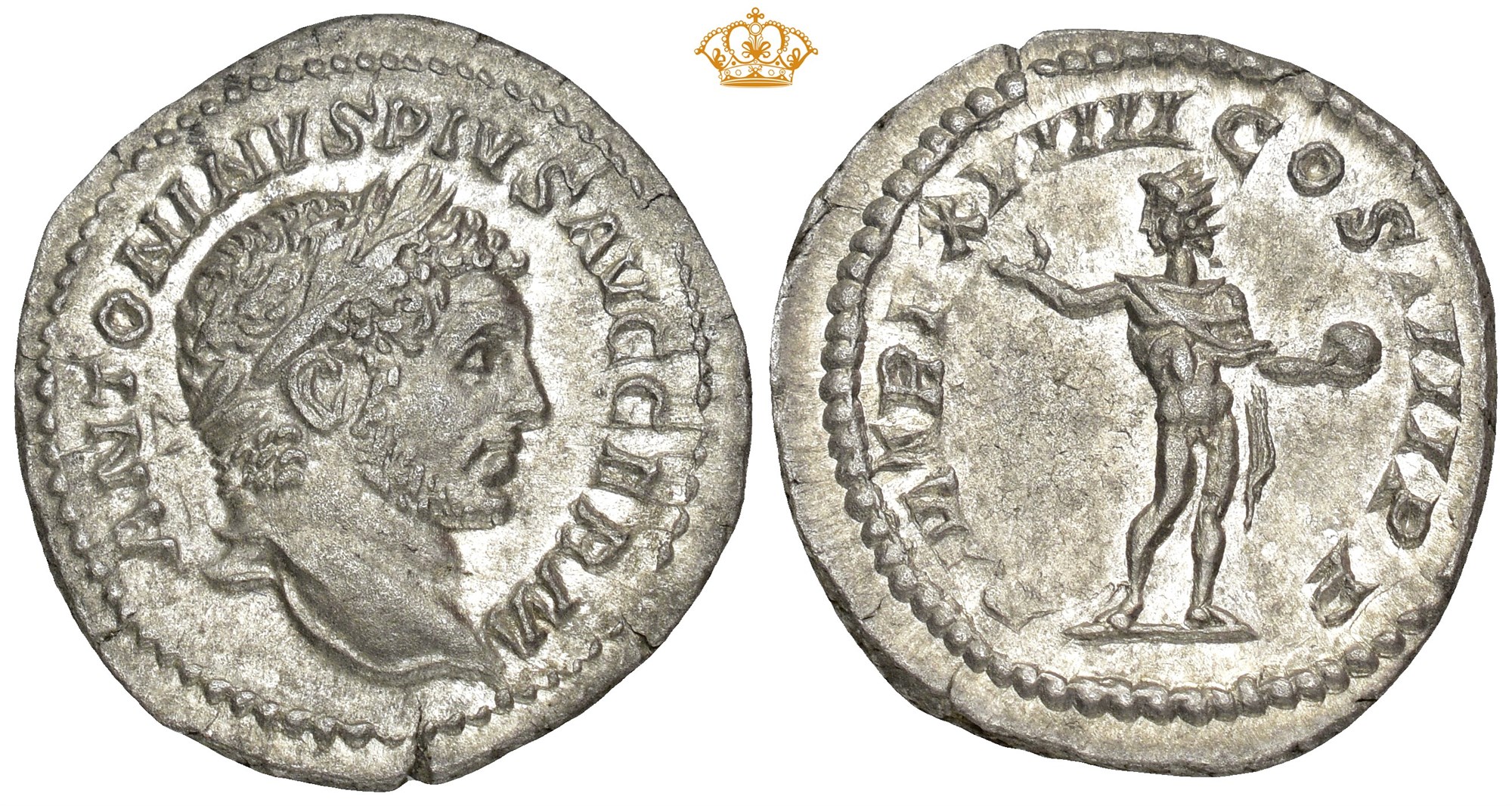 Caracalla, AD 198-217. AR Denarius (19 mm; 2.80 g). Rome mint, struck AD 216. Laureate head right / Sol standing facing, head left, raising right hand and holding globe in left. Well centered and sharply struck on both sides. Lightly toned.