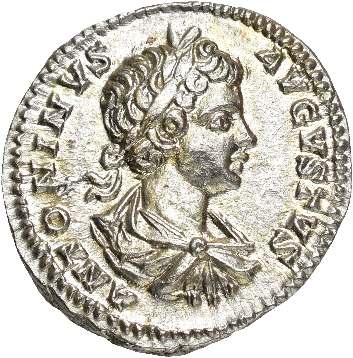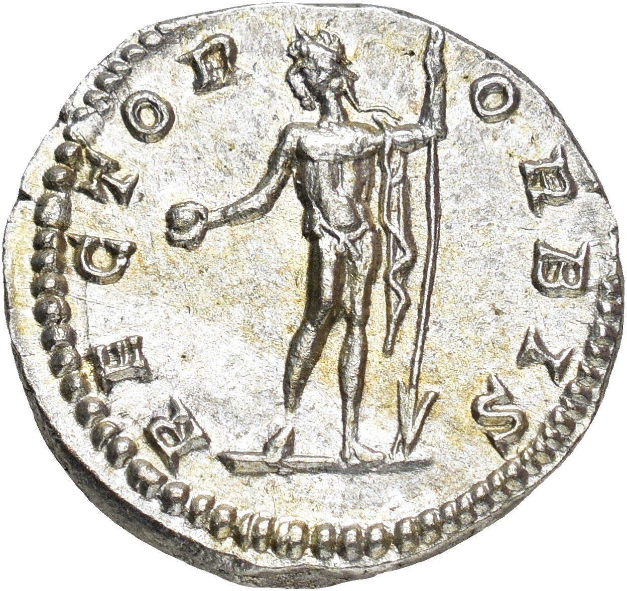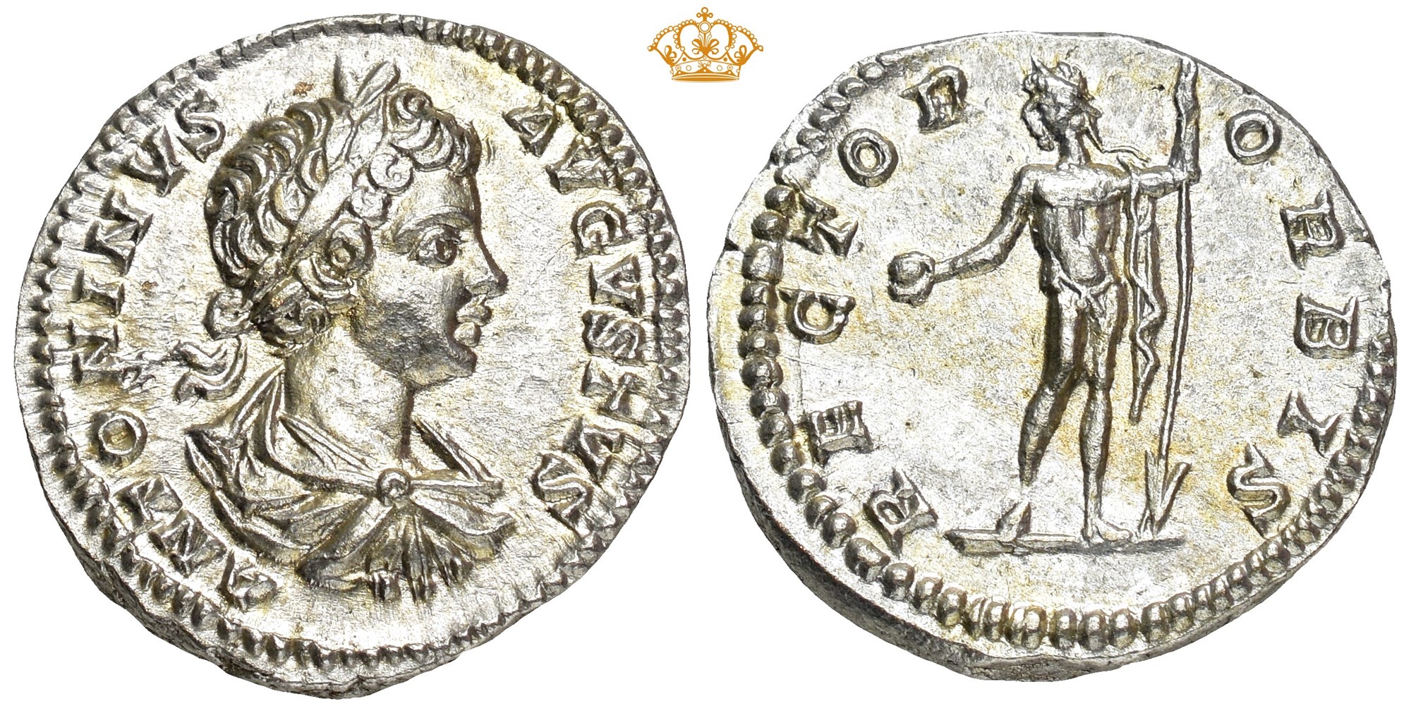 Caracalla, AD 198-217. AR Denarius (18.5 mm; 3.60 g). Rome mint, struck AD 200-201. Laureate, draped, and cuirassed bust right / Sol standing left, holding globe in right hand and reversed spear in left. Sharply struck on both sides. Bright surfaces.