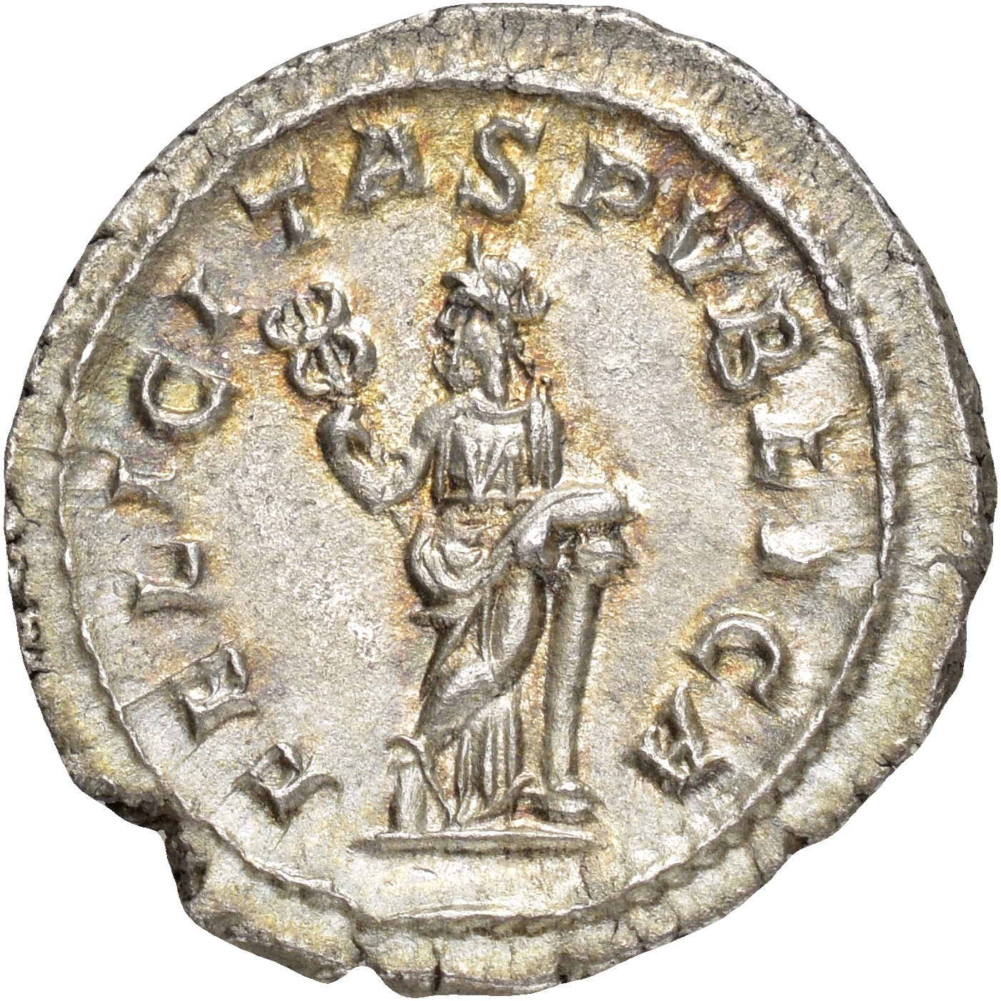 Julia Mamaea. Augusta, AD 222-235. AR Denarius (21 mm; 3.18 g). Rome mint. Struck under Severus Alexander, AD 228. Draped bust right, wearing stephane / Felicitas standing left, her legs crossed, holding caduceus in right hand and leaning left elbow on column. Sharply struck on a broad flan and with an attractive light iridescent toning.