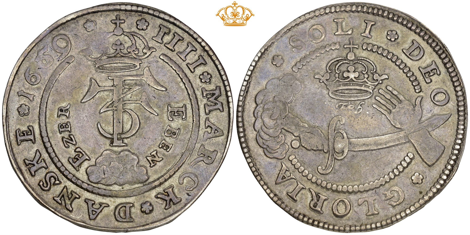 4 mark / krone 1659, København. 21.95 g. Eben Ezer - uvanlig variant med 'hjælpens sten'