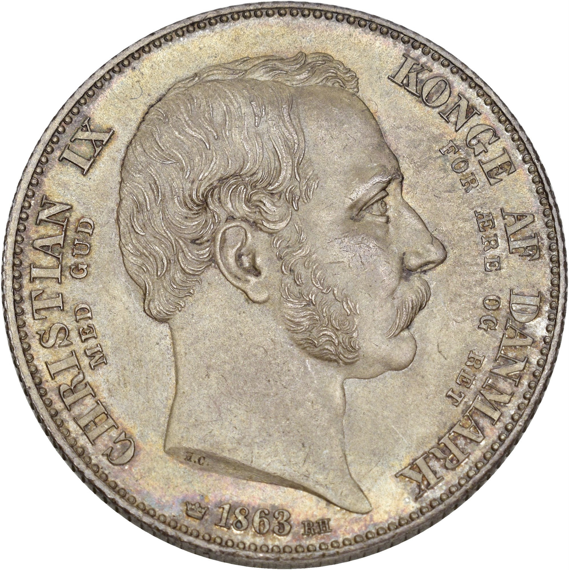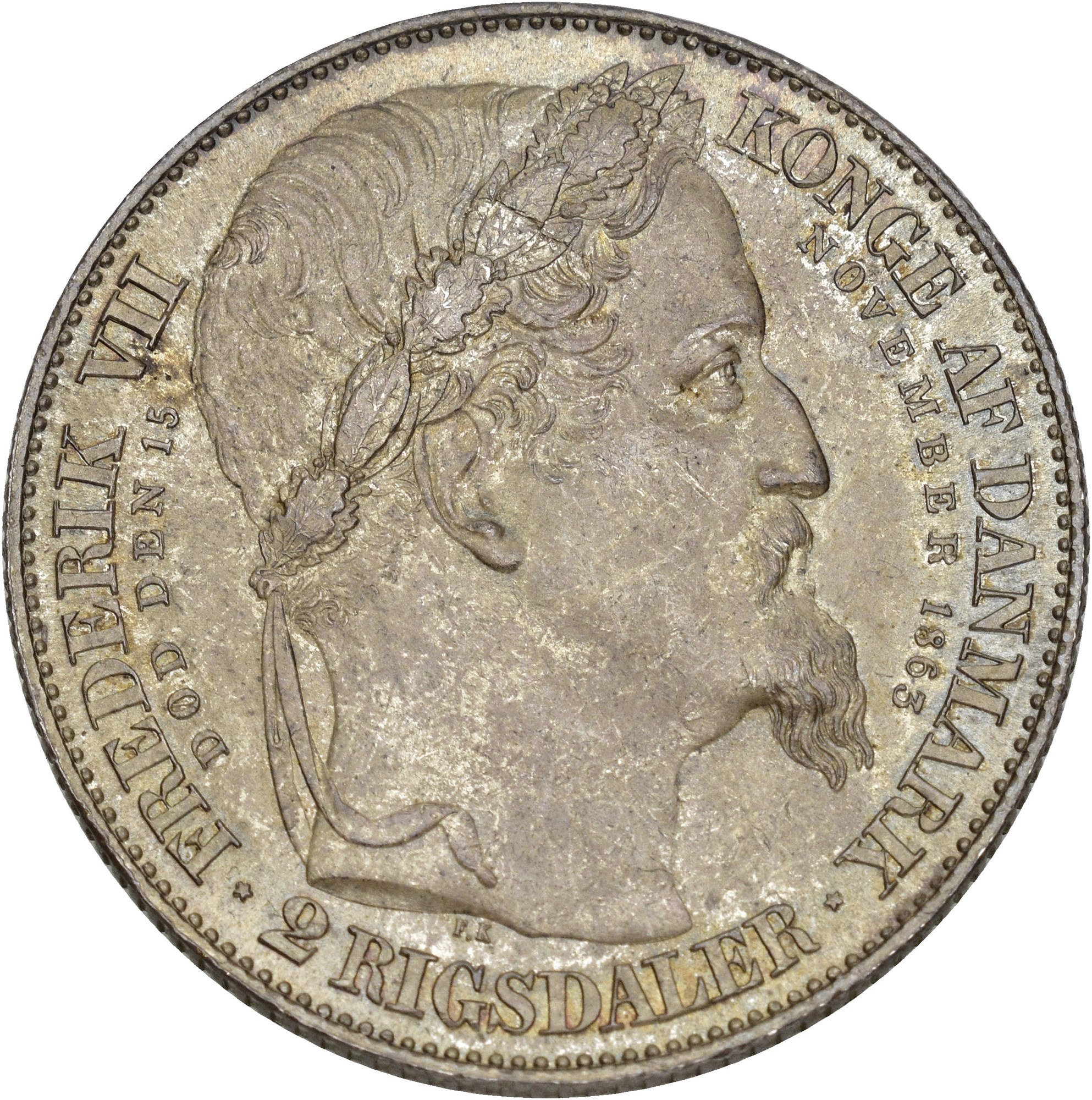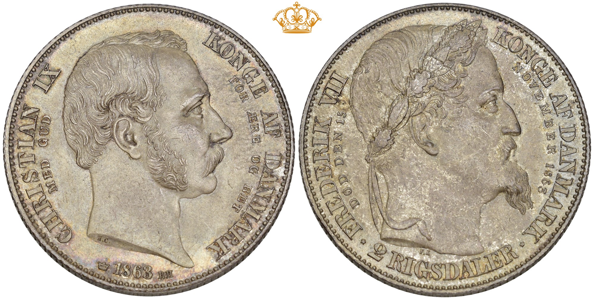 2 rigsdaler 1863, København. 28.97 g. Fint tonet prakteksemplar preget i anledning av tronskiftet.