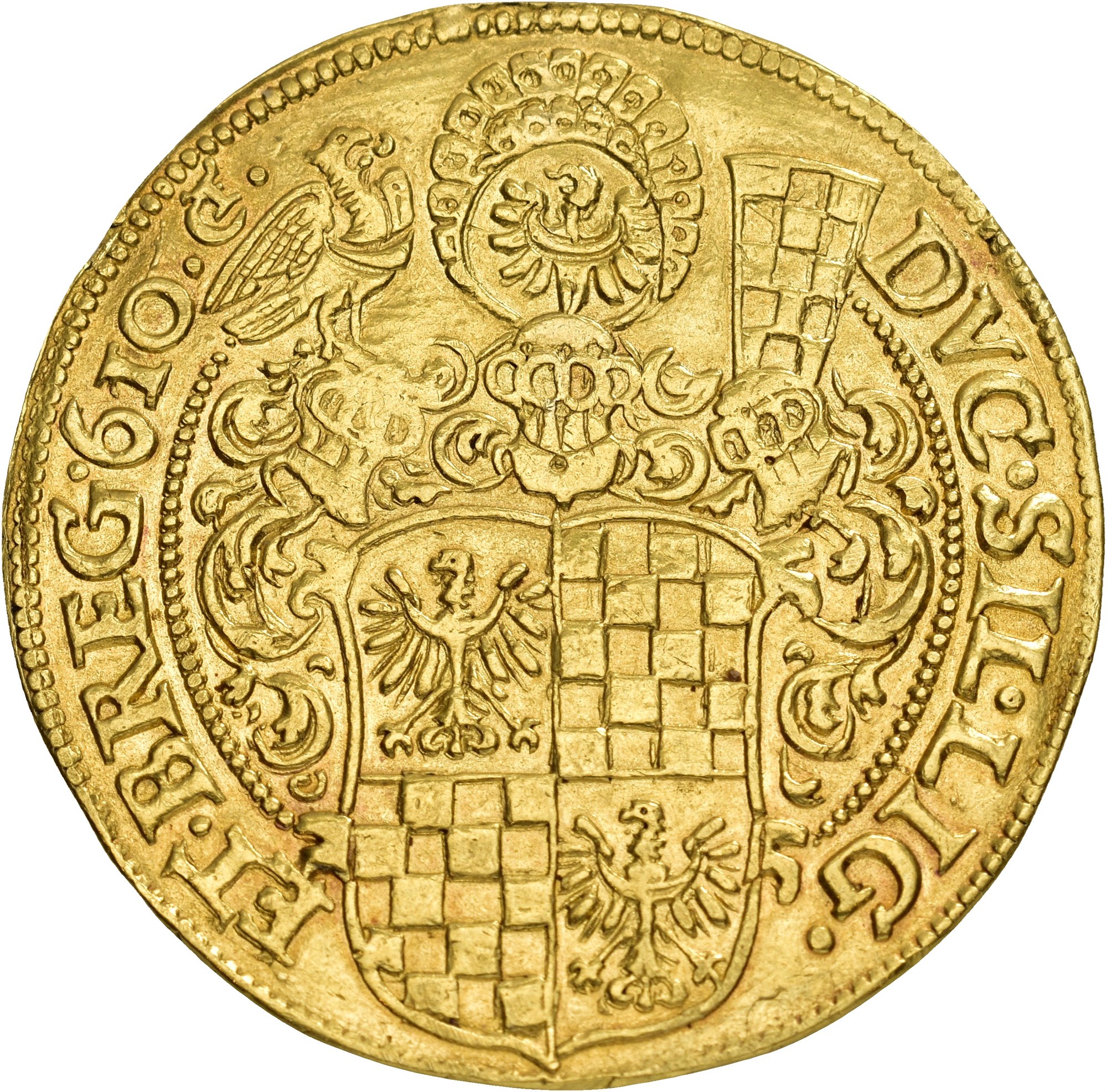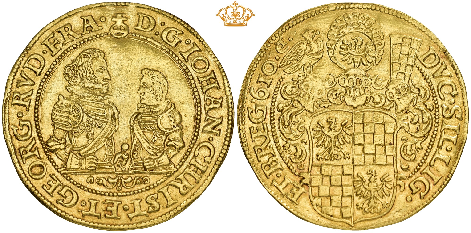 6 Ducats 1610, Reichenstein. 20,55 g. Armored half-length figures facing each other; above, an imperial orb dividing the legend // Quartered coat of arms surmounted by three helmets. Edge and fields lightly tooled. Of great rarity.