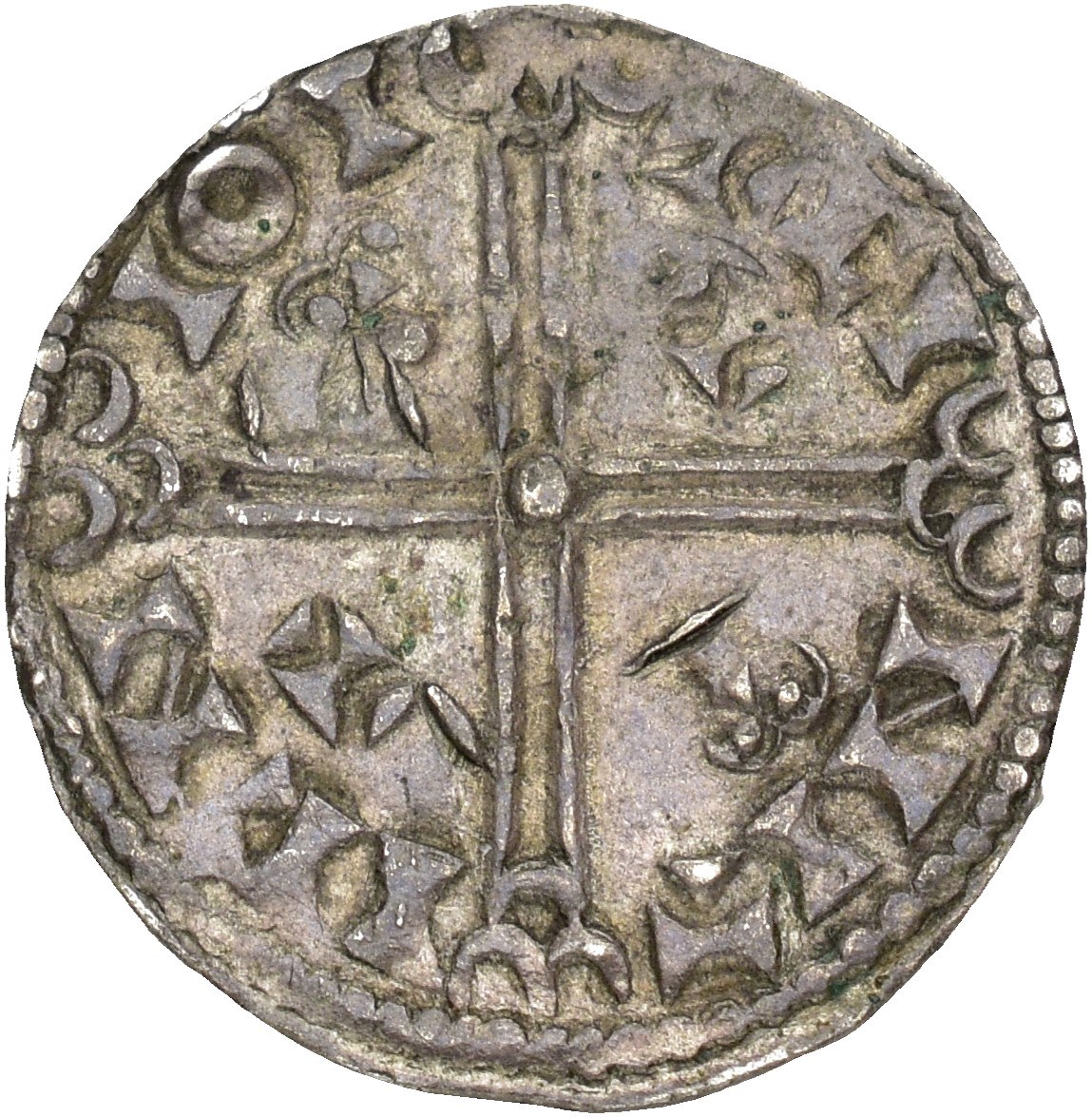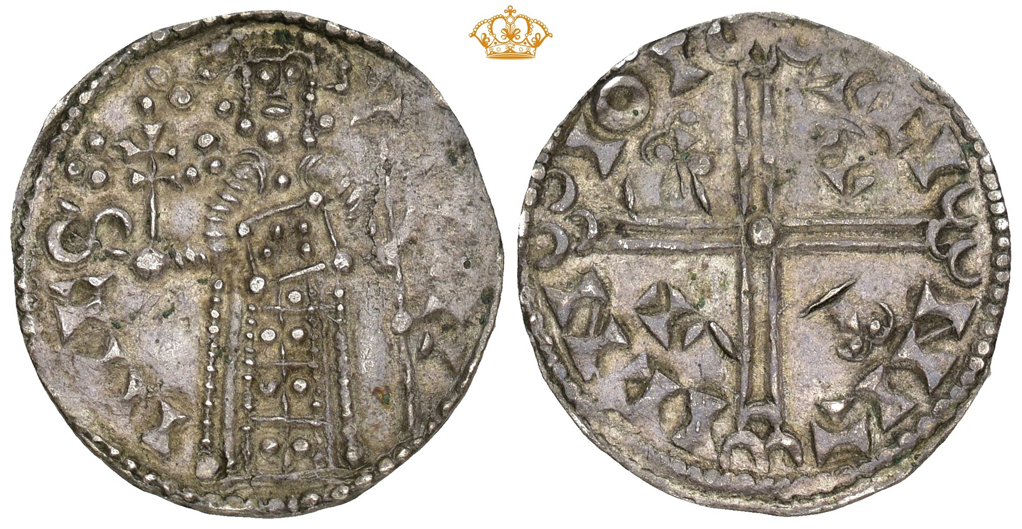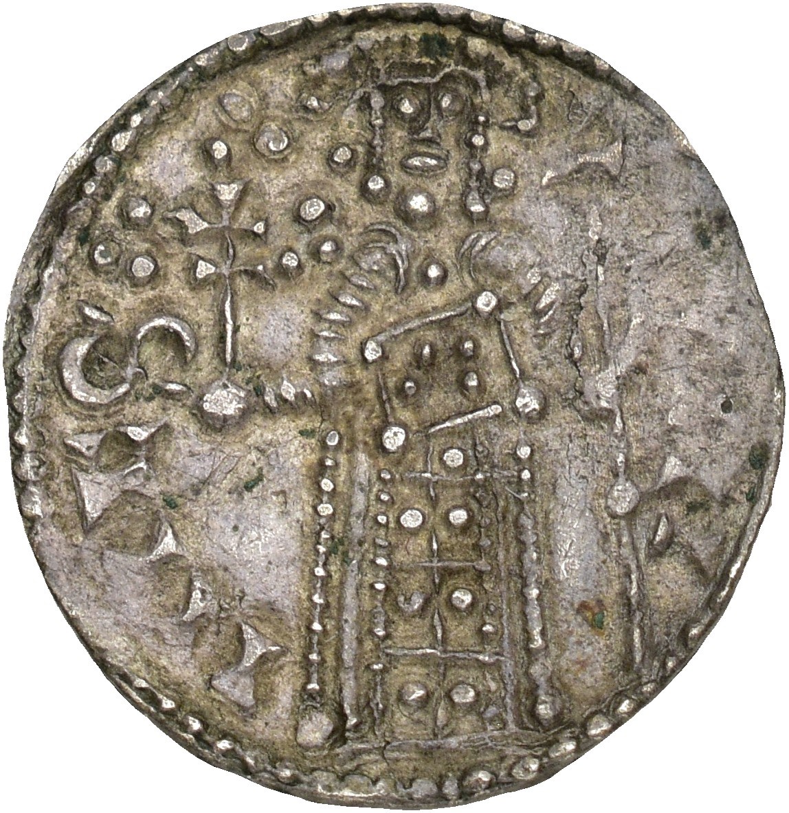 Penning, Lund. 1.05 g. Uhyre sjelden variant, hvor kongen 'holder' patriarkalkors og bibel.