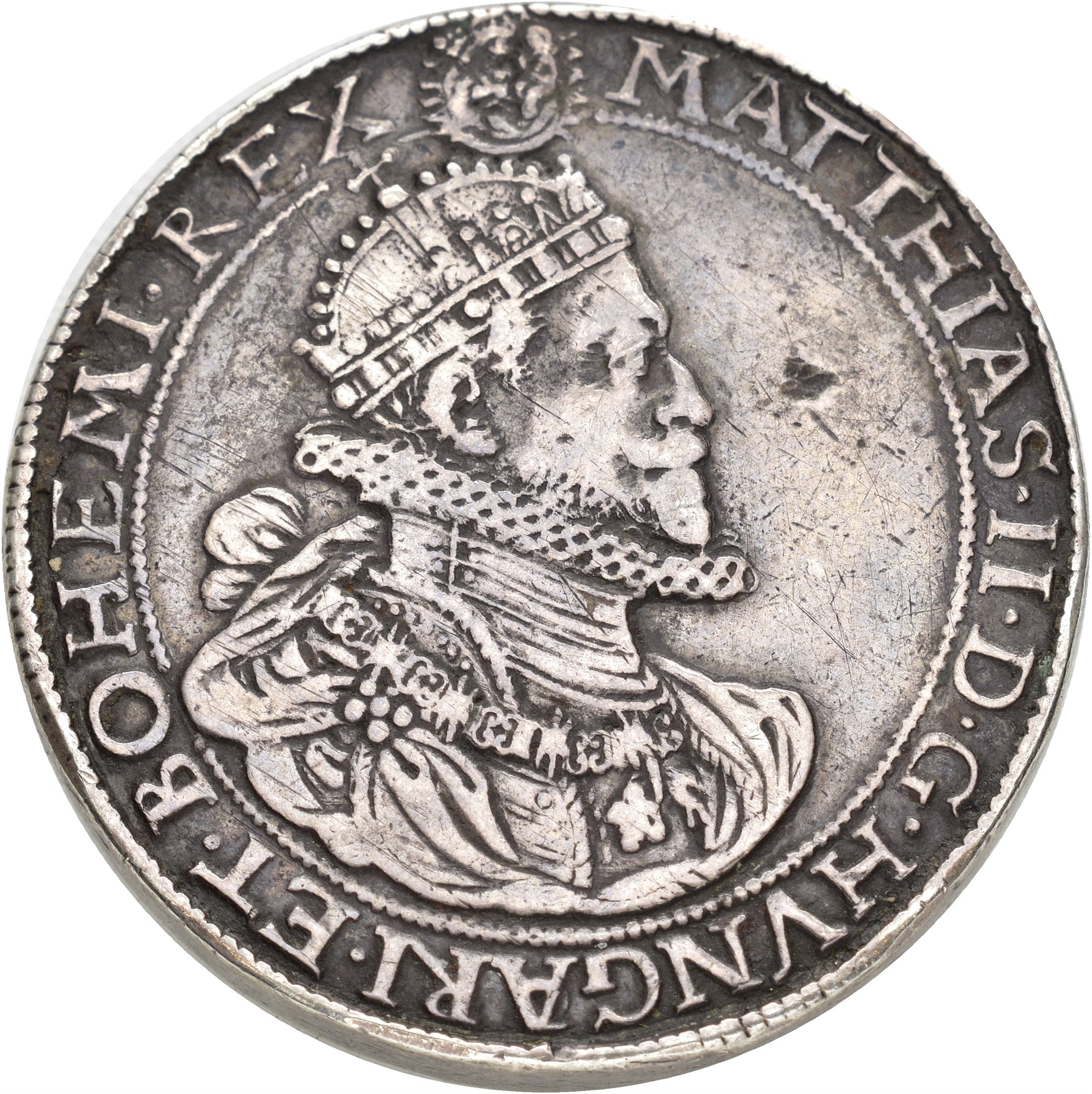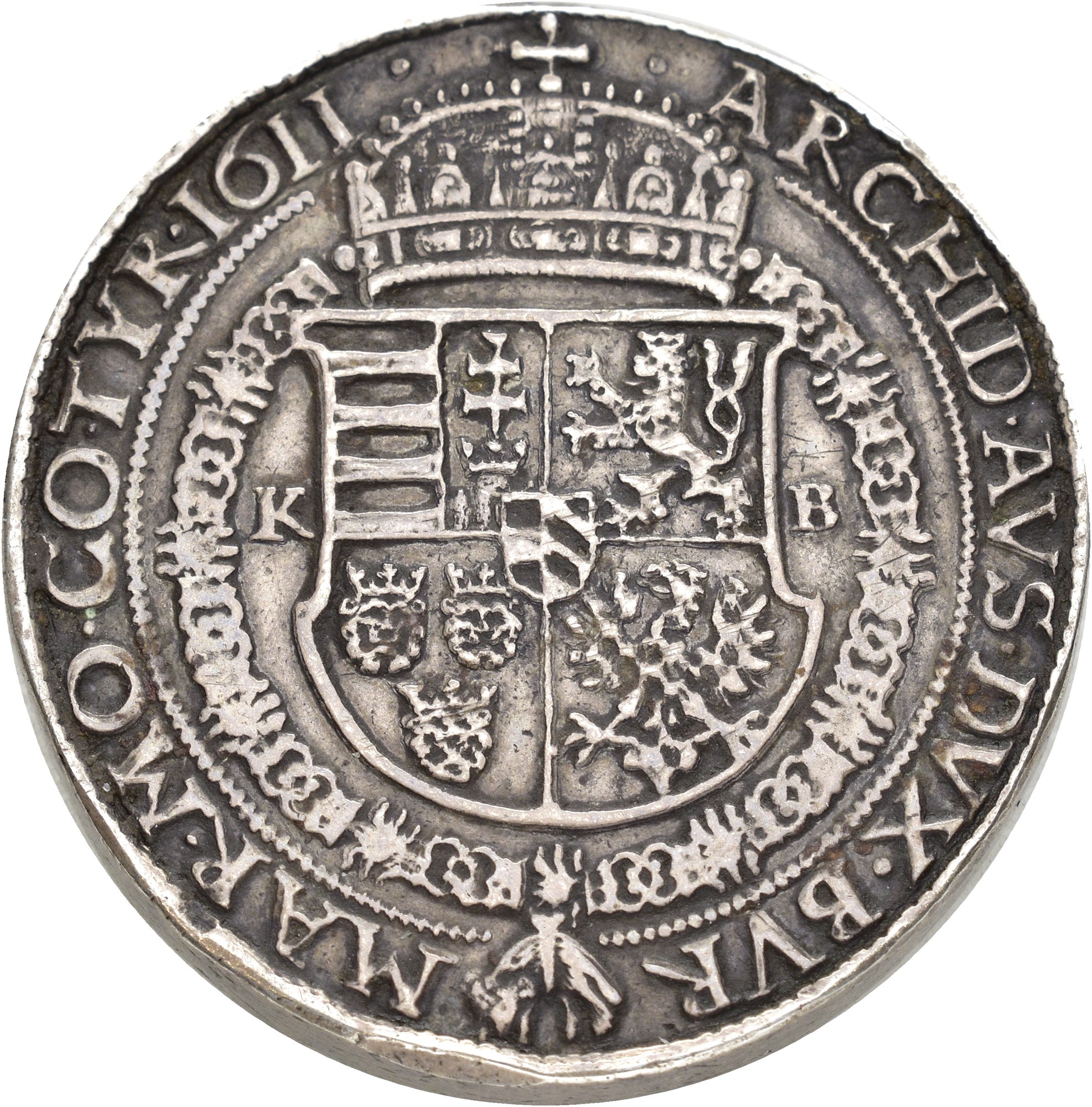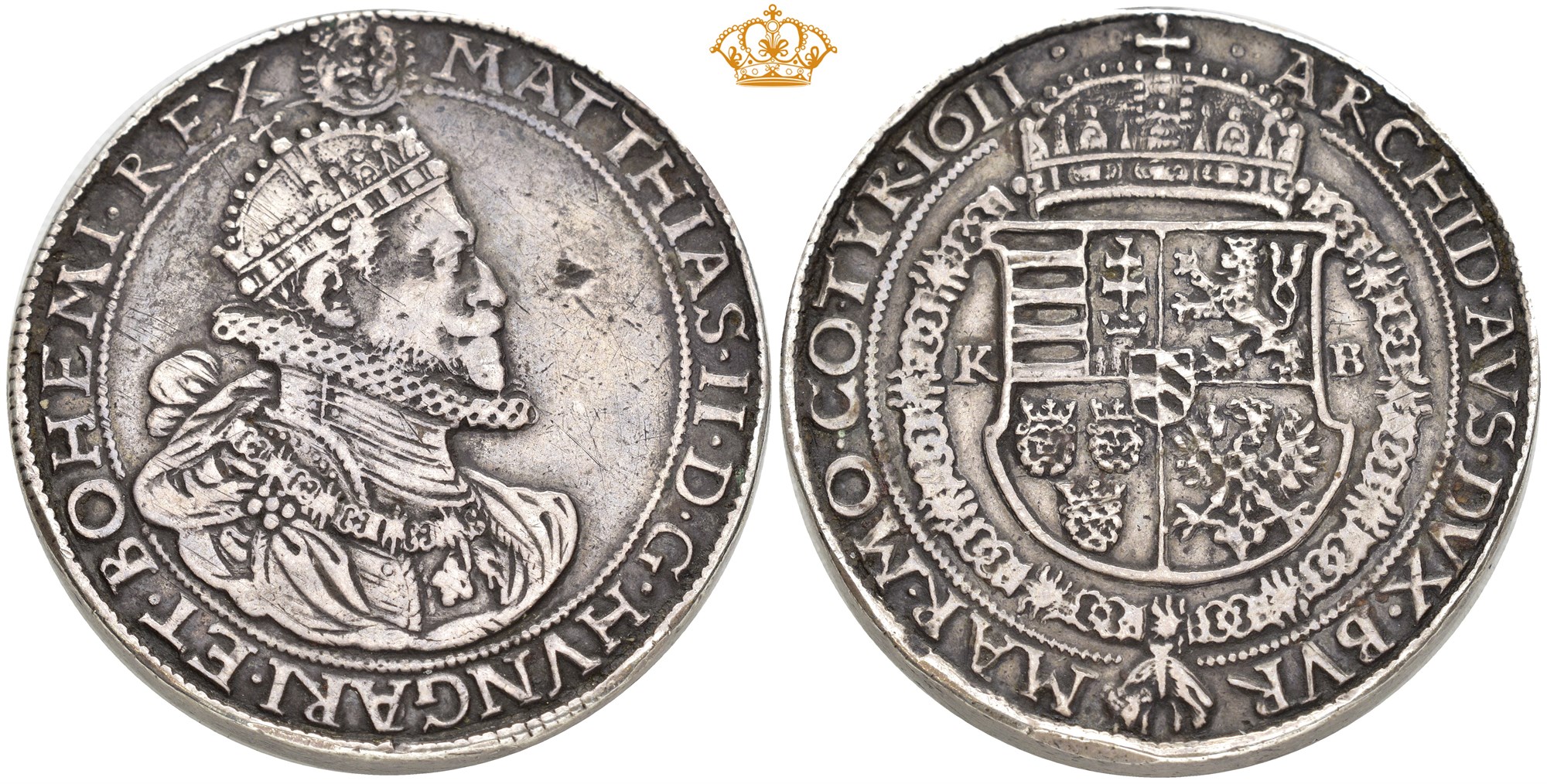 3 taler 1611, Kremnitz. 84.55 g. Crowned, armored bust with mantle and large ruff facing right. MATTHIAS.II.D.G.HUNGARI.ET.BOHEMI.REX/ Crowned coat of arms between mintmark K – B, surrounded by the collar of the Order of the Golden Fleece.