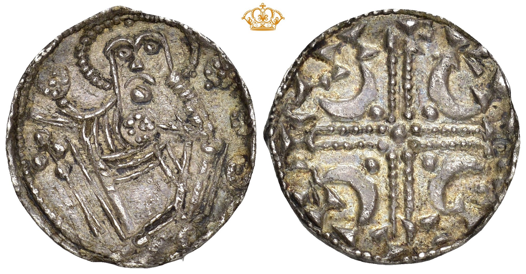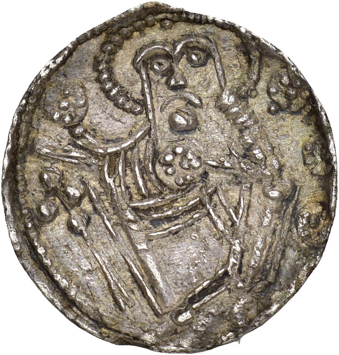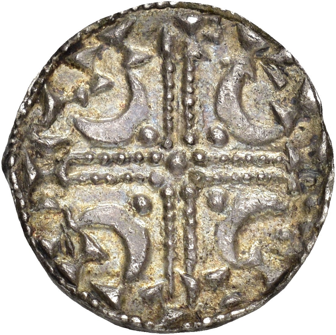 Penning, Lund. 0.94 g. Møntmester Ulfkil. Pent tonet eksemplar av sjelden og interessant variant med perlekors.