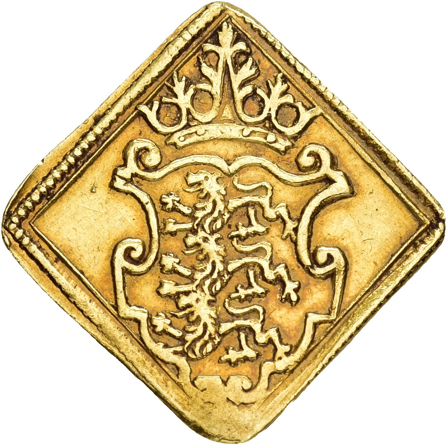 Interessant guldklipping utmyntet av Hans Köppelin og Lauritz Hammer på Mønten i Bremerholm i kun 1.399 eksemplarer.