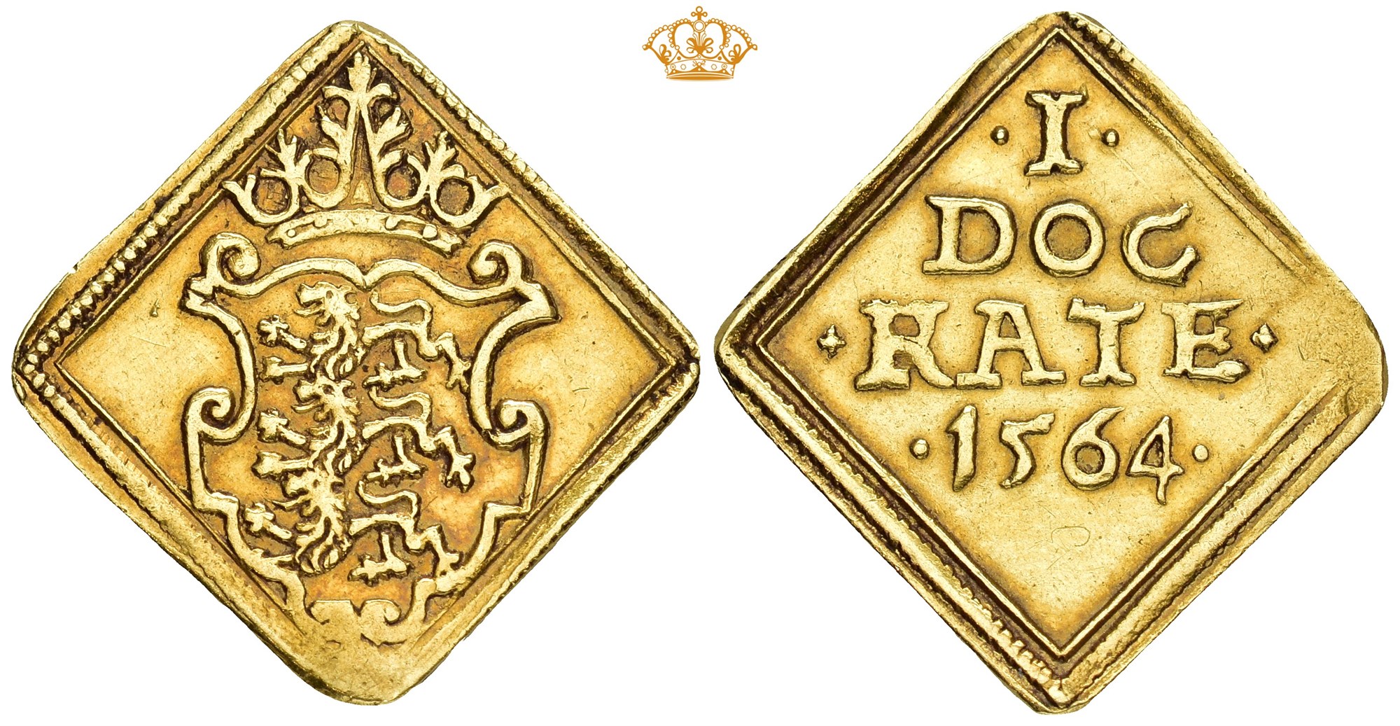 Dukat 1564, København. 3.46 g. Lille testspor i nedre hjørne. Revers med utraditionelle verdiangivelse 1 DOCKATE. Fint eksemplar med fin lett rødlig toning.