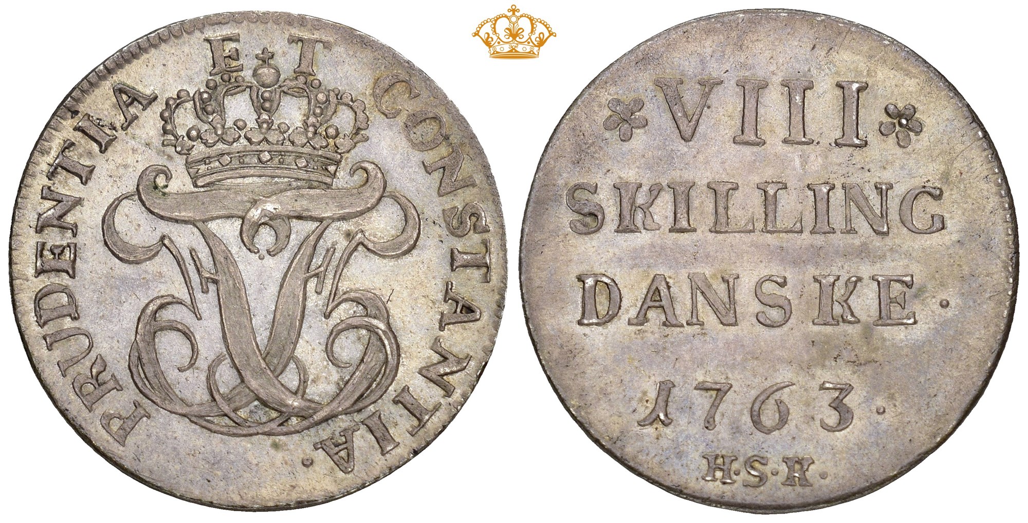 8 skilling 1763, København. 2.95 g. Særdeles sjelden i denne kvaliteten.