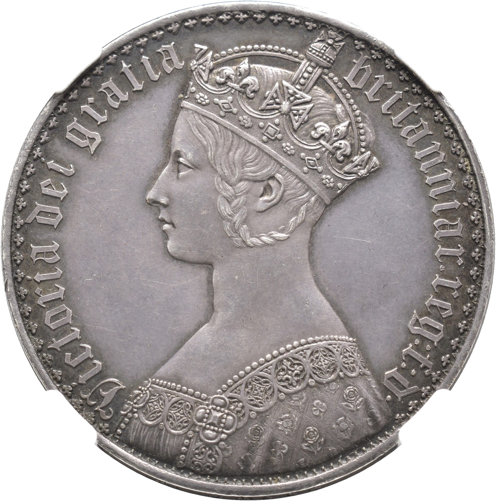 Gothic Crown 1847, London Mint. 28,3 g. Edge inscription UN DECIMO. Graded as PF61 by NGC