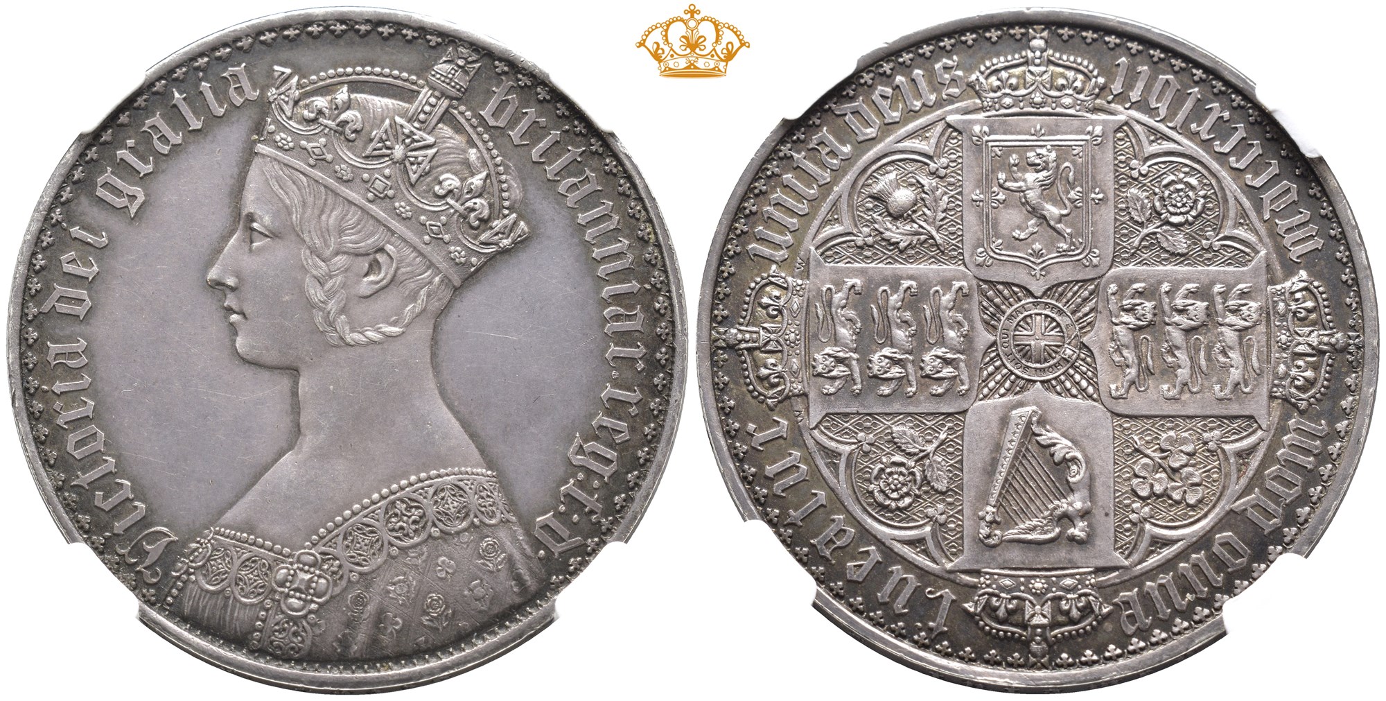Gothic Crown 1847, London Mint. 28,3 g. Edge inscription UN DECIMO. Graded as PF61 by NGC