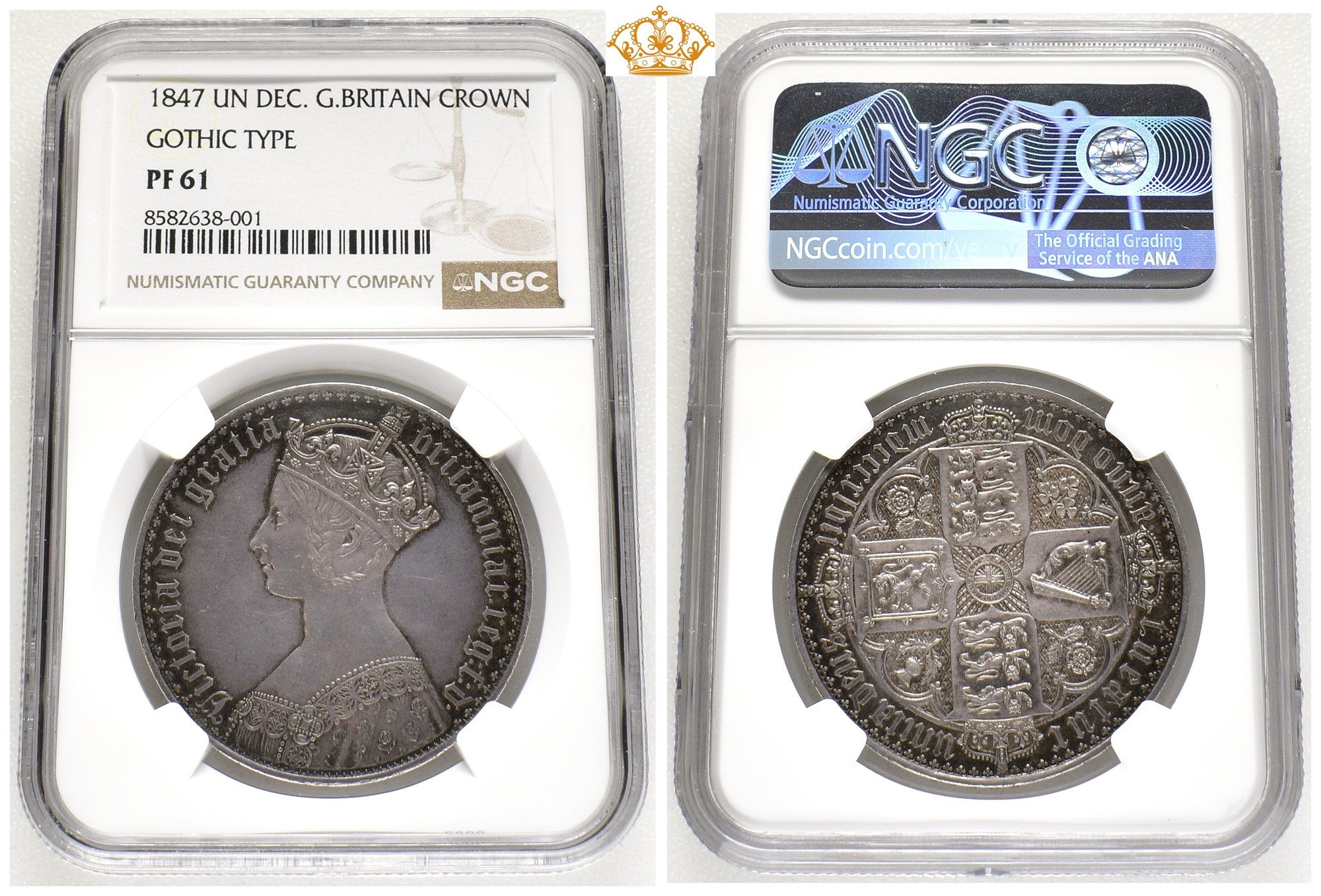 Gothic Crown 1847, London Mint. 28,3 g. Edge inscription UN DECIMO. Graded as PF61 by NGC
