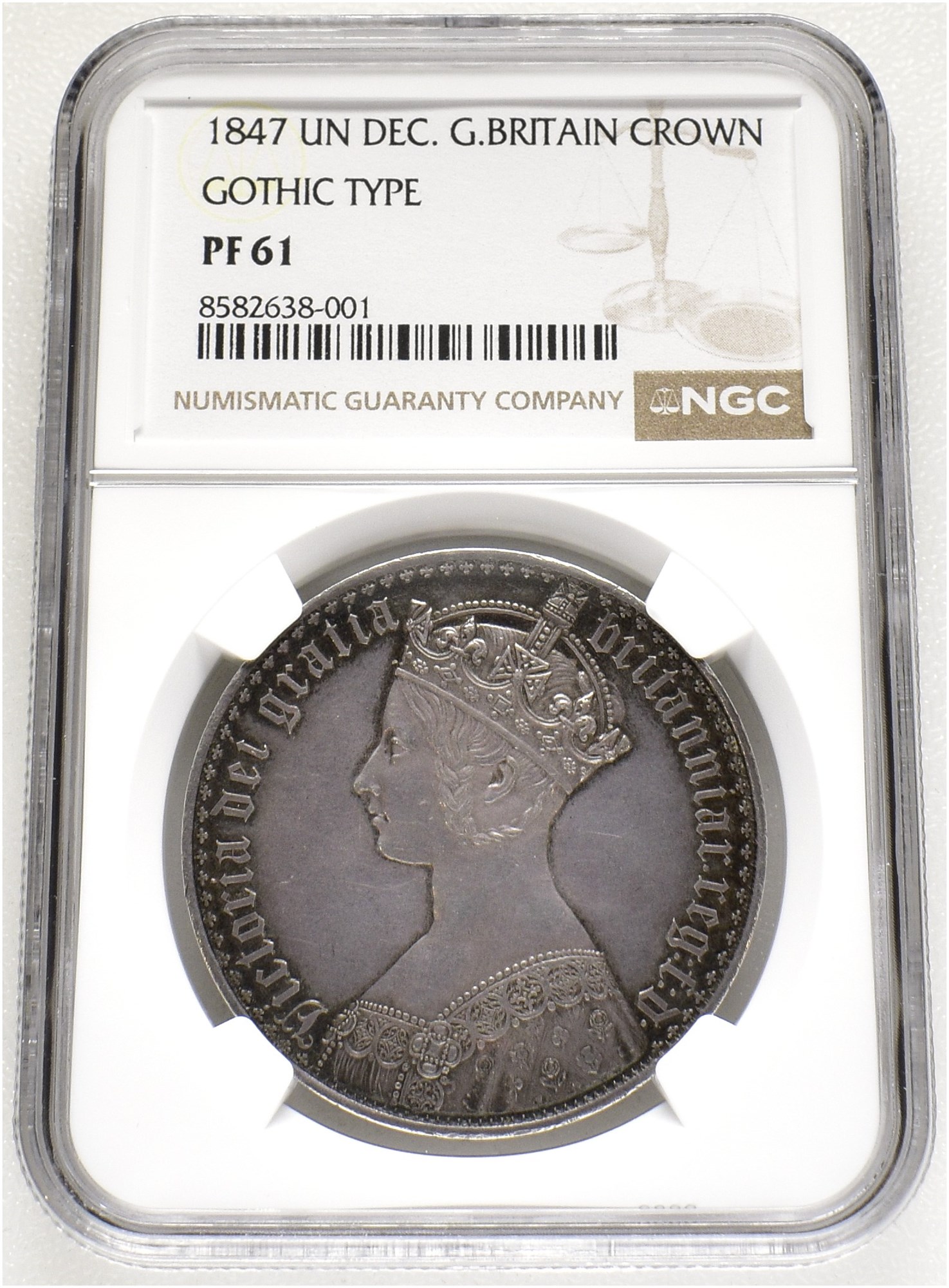 Gothic Crown 1847, London Mint. 28,3 g. Edge inscription UN DECIMO. Graded as PF61 by NGC