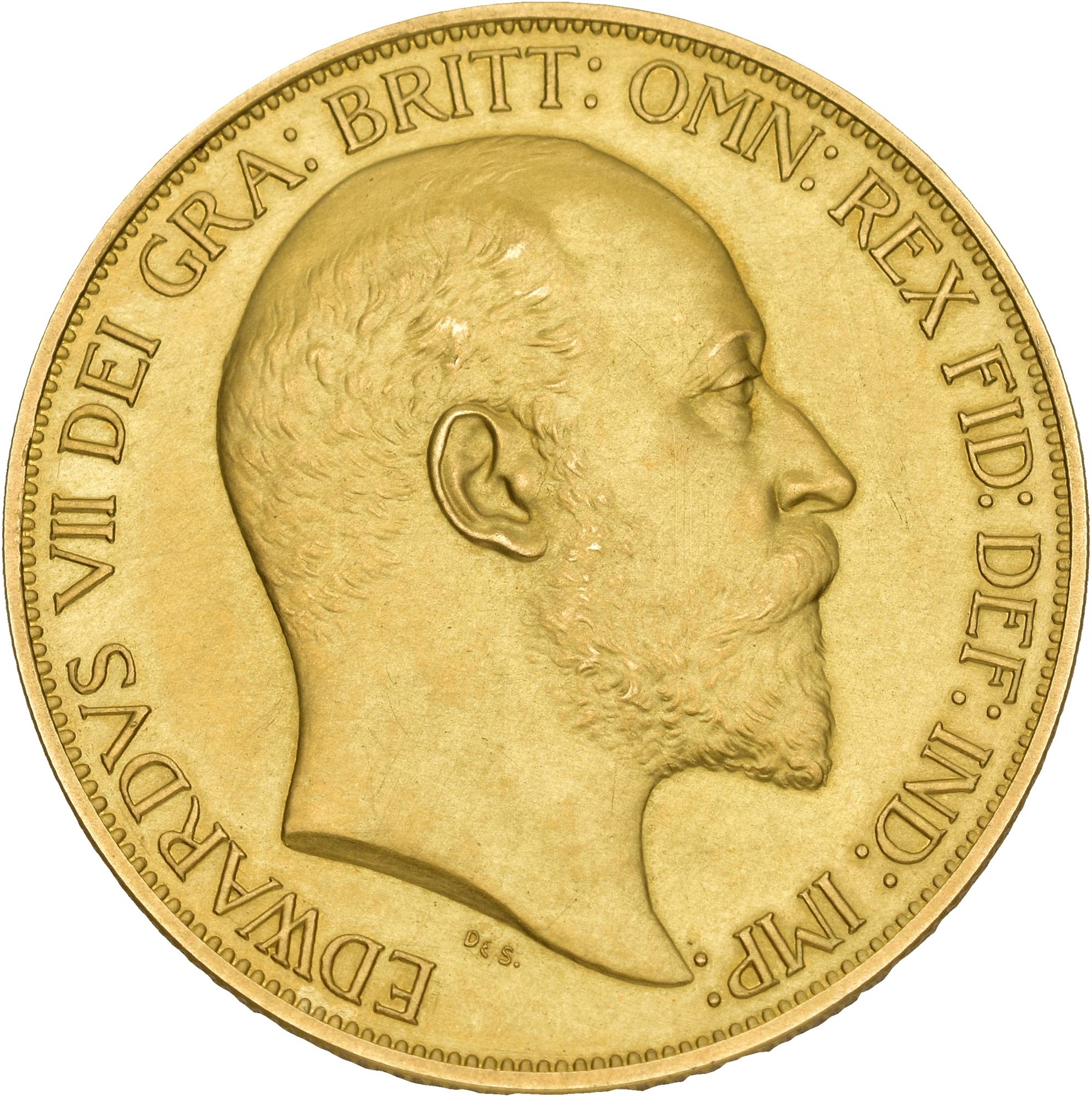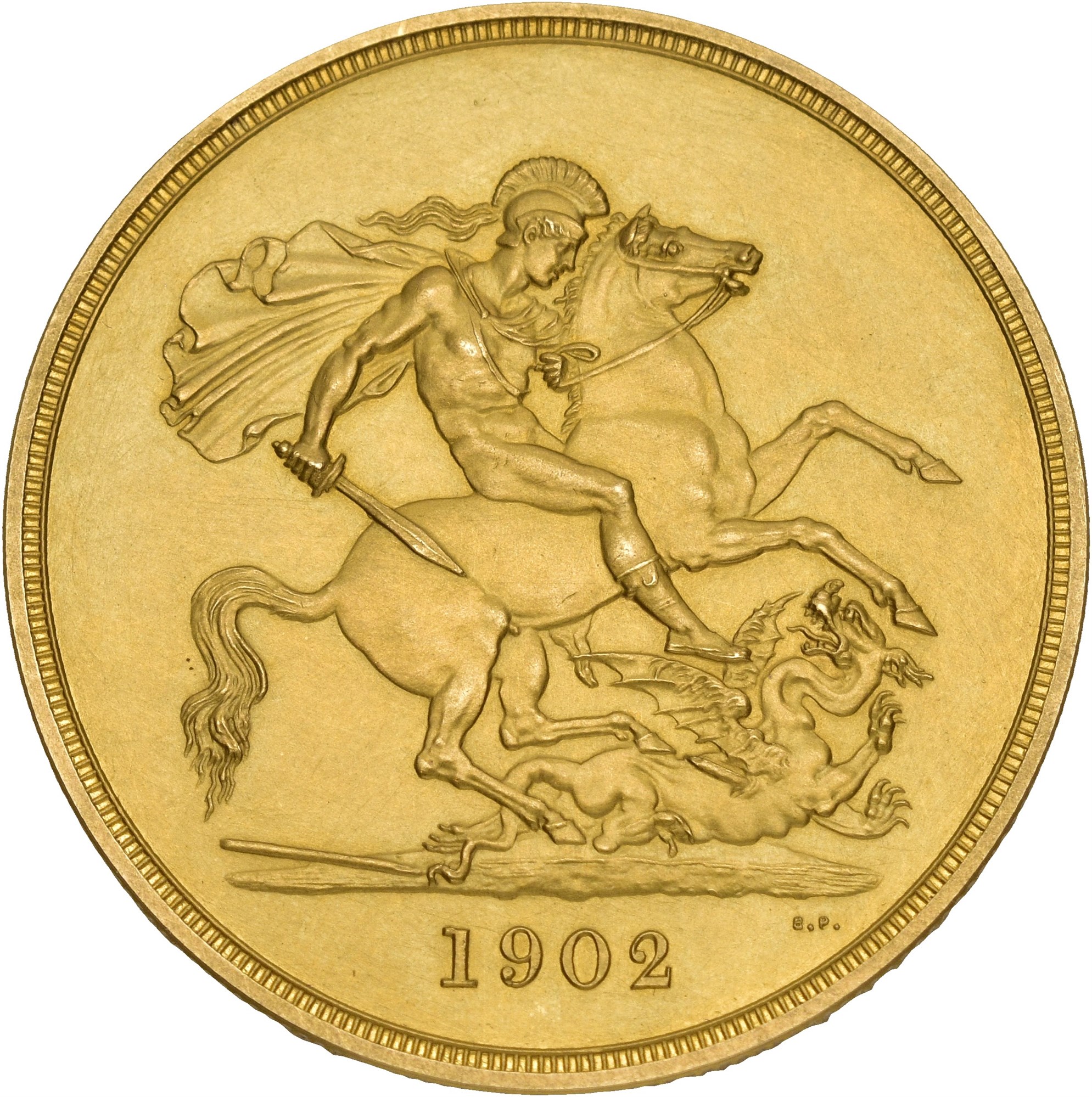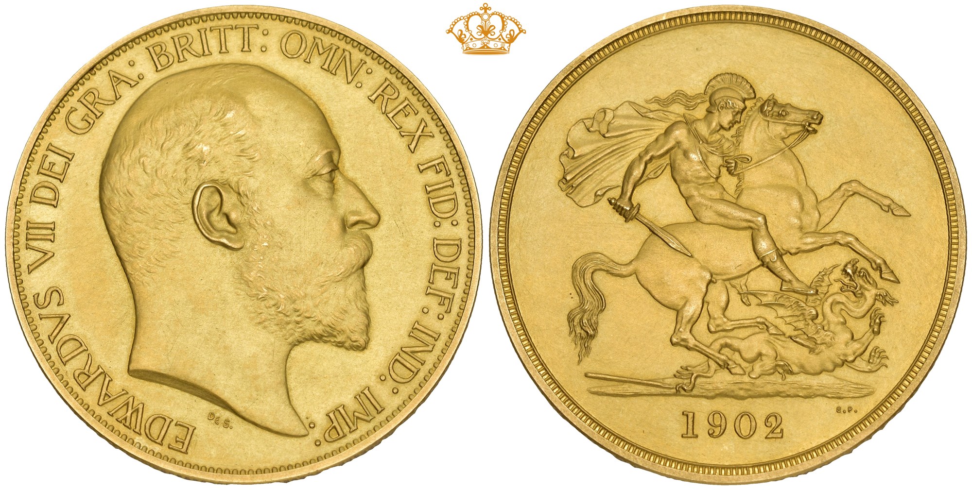 5 pounds 1902, London. 33,98 g. Issued in 1902 as accession issues of Edward VII, these Matte Proof coins bear his first official coin portrait by G.W. de Saulles and were produced contemporaneously with his coronation.