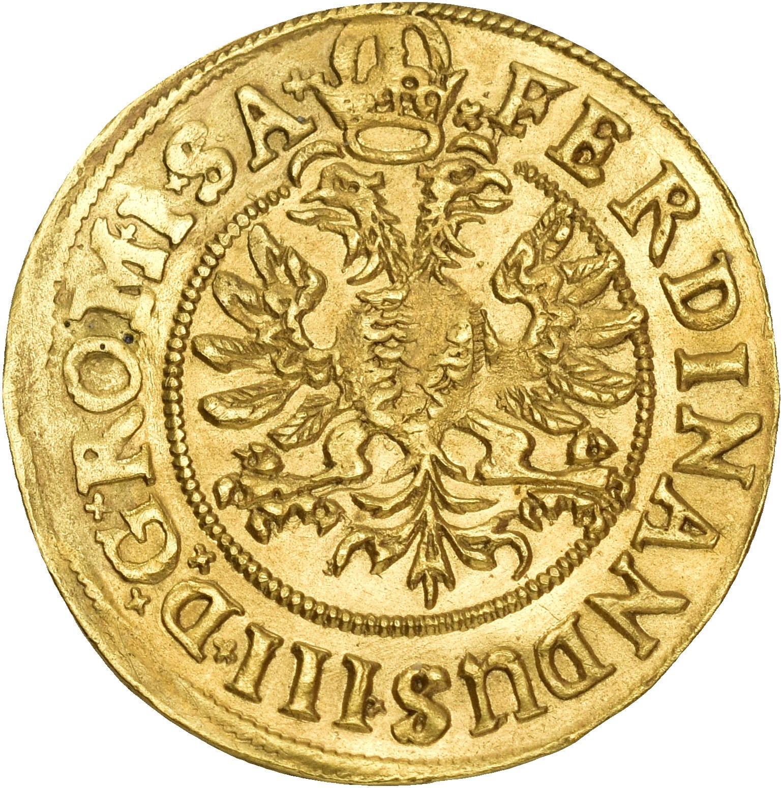 Dukat 1644, Stralsund. 3,44 g. Med titlene til Ferdinand III. Myntmester Caspar Sievers. Strålende solstråle omgitt av laurbærgrener / kronet dobbeltørn. Minimalt buklet.