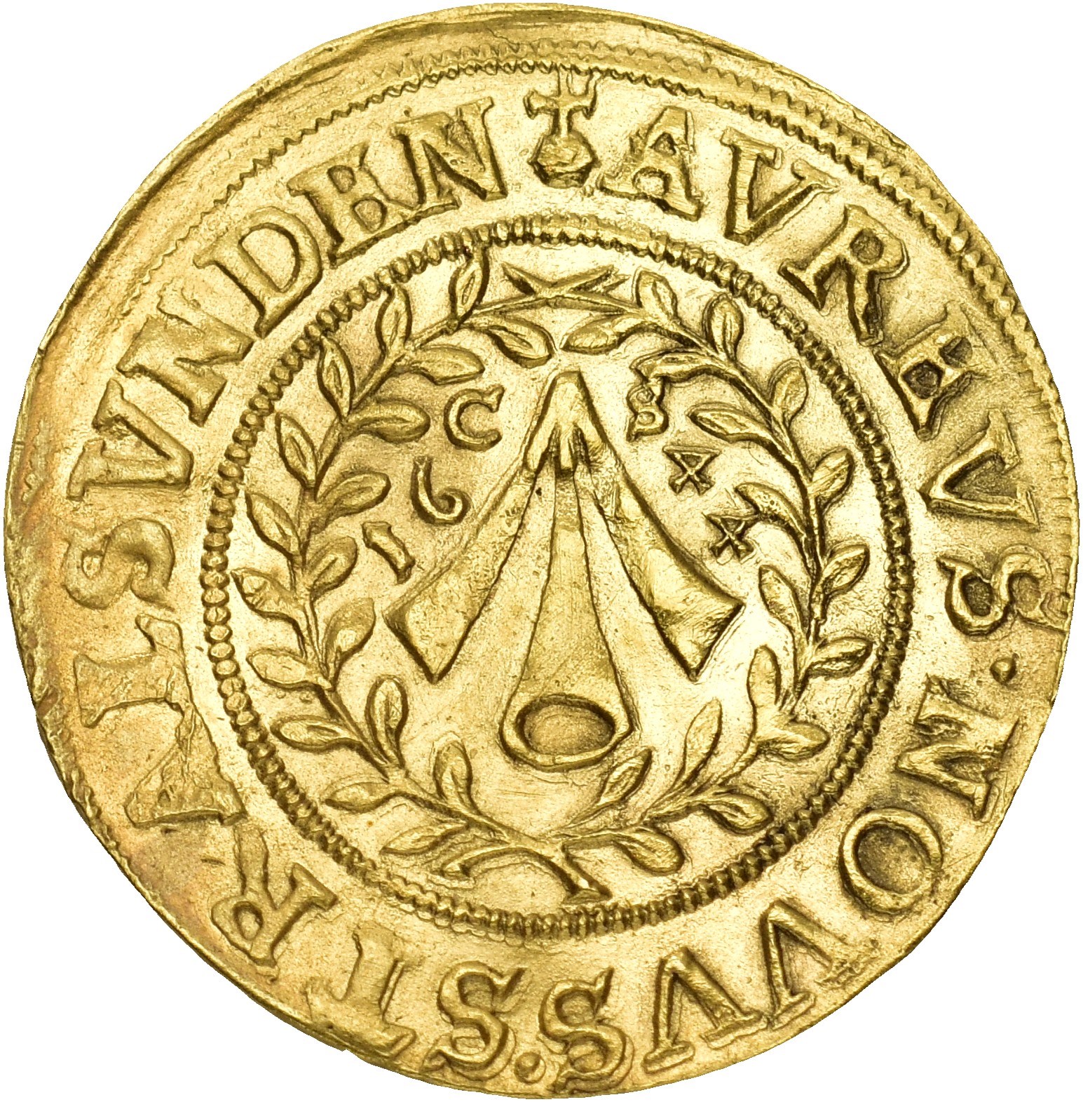 Dukat 1644, Stralsund. 3,44 g. Med titlene til Ferdinand III. Myntmester Caspar Sievers. Strålende solstråle omgitt av laurbærgrener / kronet dobbeltørn. Minimalt buklet.