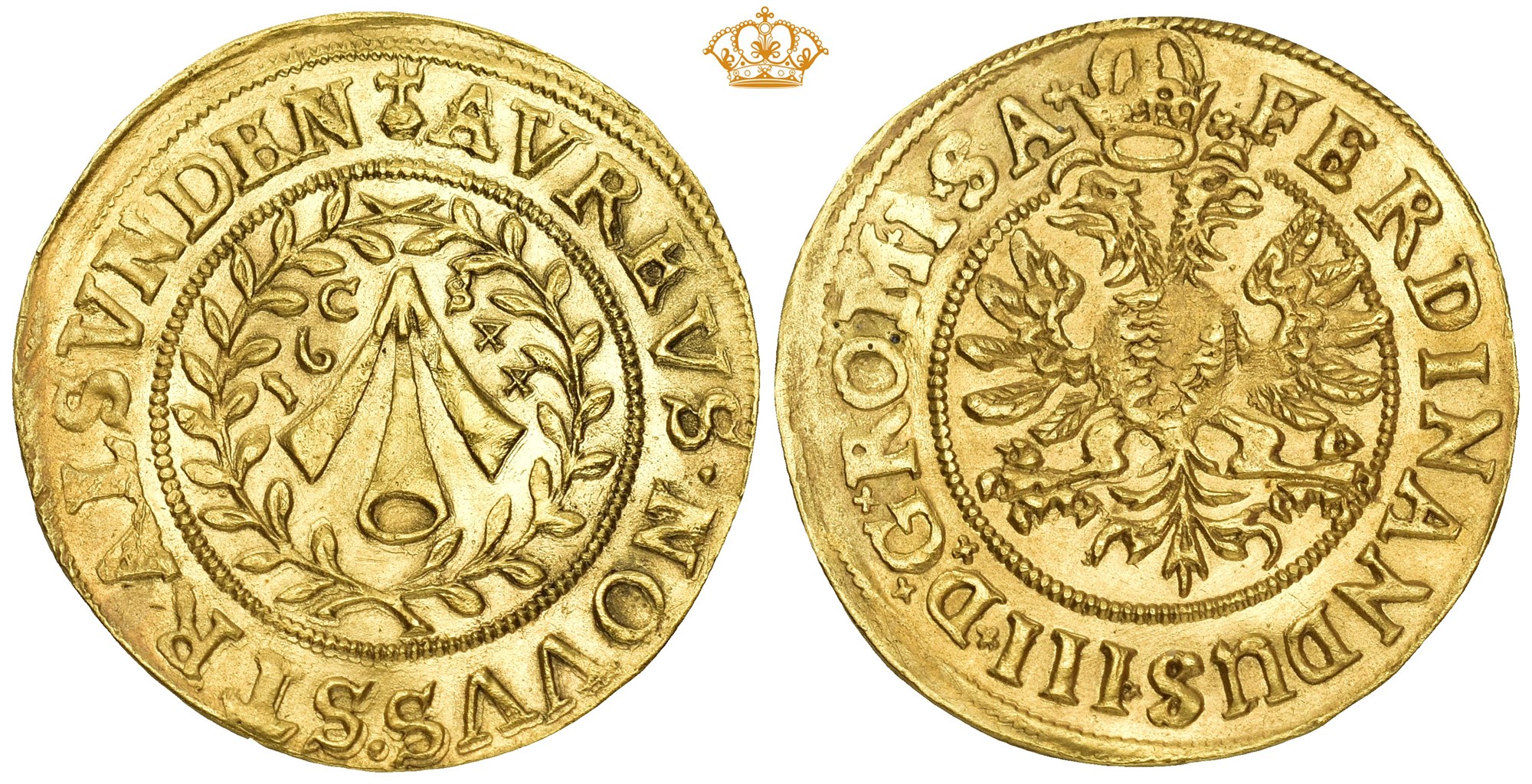 Dukat 1644, Stralsund. 3,44 g. Med titlene til Ferdinand III. Myntmester Caspar Sievers. Strålende solstråle omgitt av laurbærgrener / kronet dobbeltørn. Minimalt buklet.