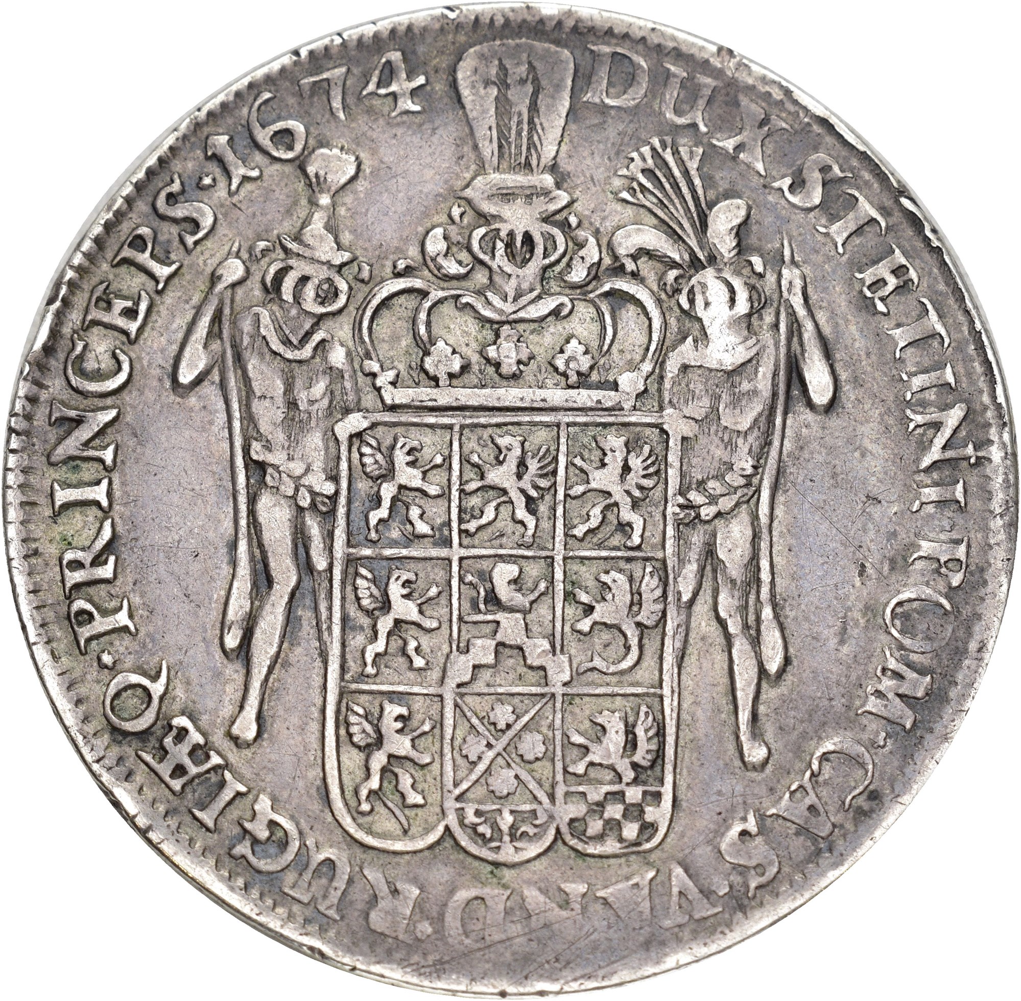 Taler 1674, Stettin. 28,96 g. Myntmester Daniel Syvertz. Laurbærkronet og drapert ungdommelig brystbilde mot høyre / Hjelmbesatt, flerfeltet våpen holdt av to hjelmbærende ville menn. Very rare.