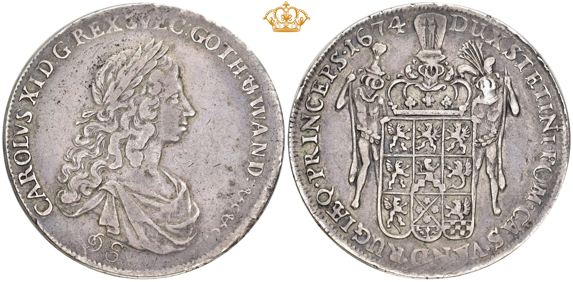 Taler 1674, Stettin. 28,96 g. Myntmester Daniel Syvertz. Laurbærkronet og drapert ungdommelig brystbilde mot høyre / Hjelmbesatt, flerfeltet våpen holdt av to hjelmbærende ville menn. Very rare.