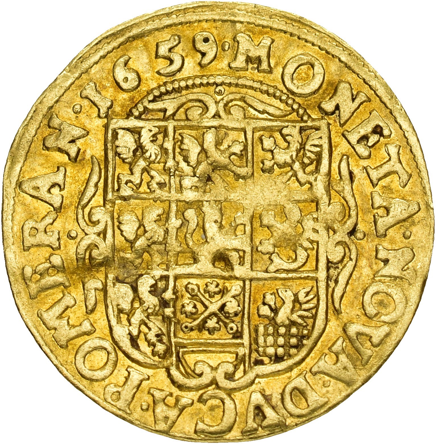 Dukat 1659, Stettin. 3,37 g. Myntmester Ulrich Butkau. Den kronede og pansrede kongen står mot høyre med sverd, bærende septeret over høyre skulder, og med rikseplet løftet i venstre hånd / Ornamentert, ni-feltet våpen for Pommern. Ubetydelig spor etter montering på randen, lett buklet.